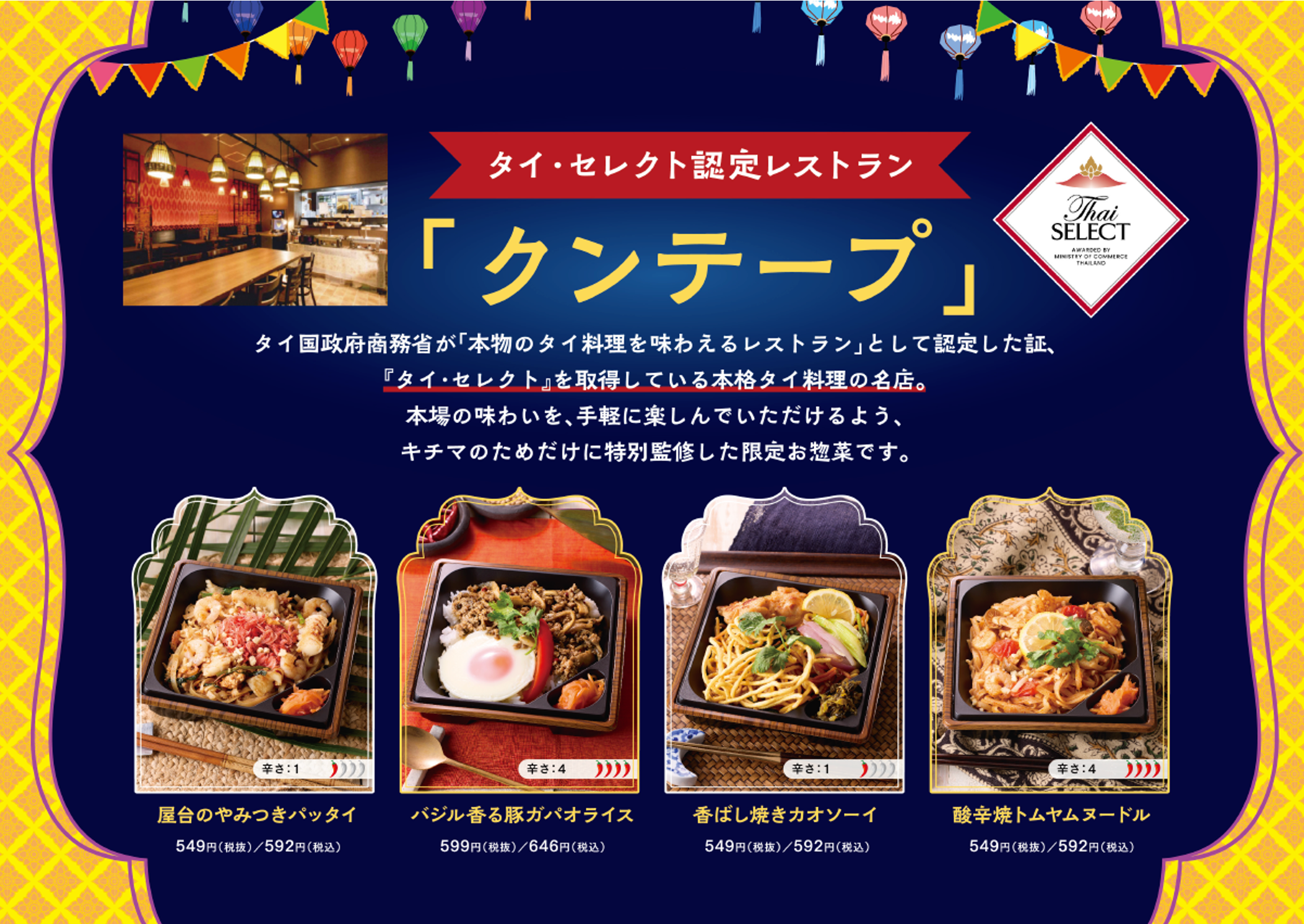 タイ国政府商務省が「本物のタイ料理を味わえるレストラン」として認定した証『タイ・セレクト』を取得している本格タイ料理の名店クンテープ。本場の味わいを、手軽に楽しんでいただけるよう、キチマのためだけに特別監修した限定お惣菜です。