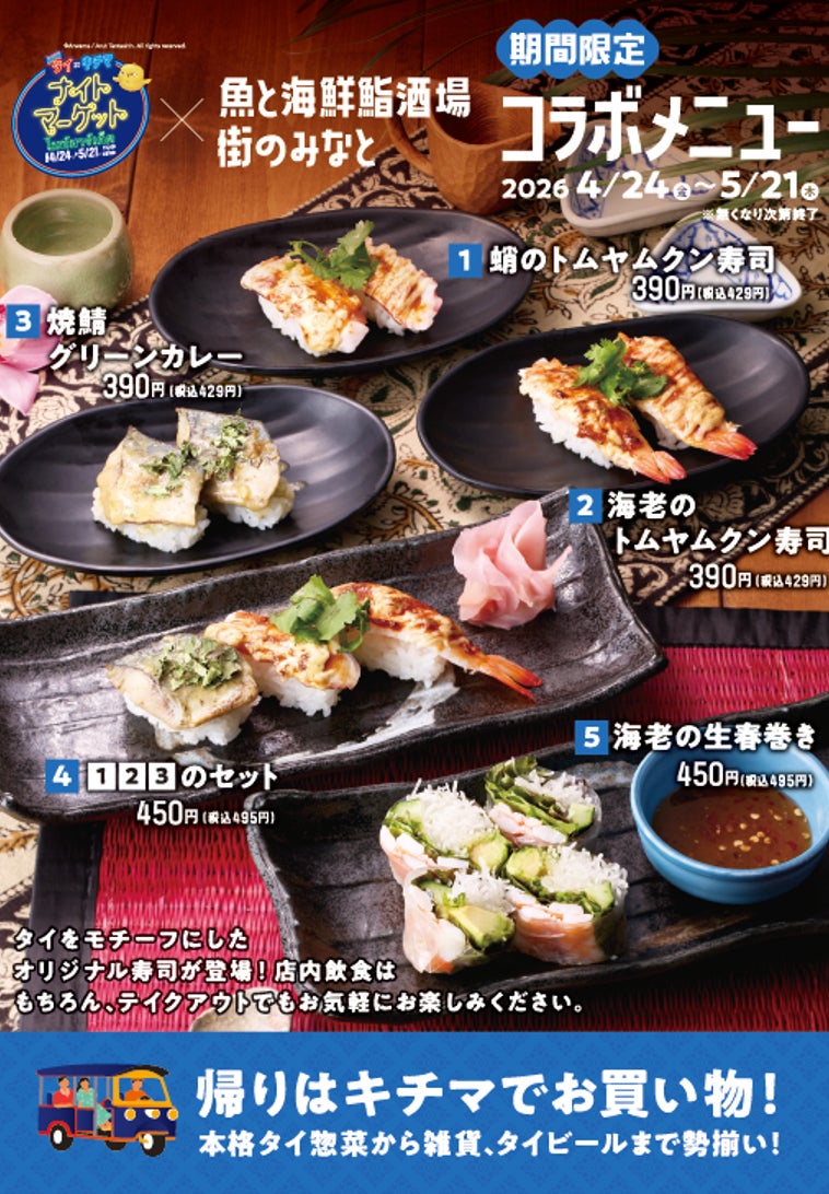 タイをモチーフにした オリジナル寿司が登場! 店内飲食は もちろん、テイクアウトでもお気軽にお楽しみください。
