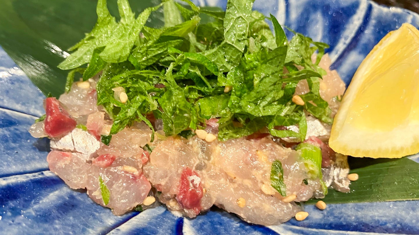 新鮮な身を叩き上げた「あじなめろう」と、それを大葉と共に揚げた「あじさんが天」をご用意。