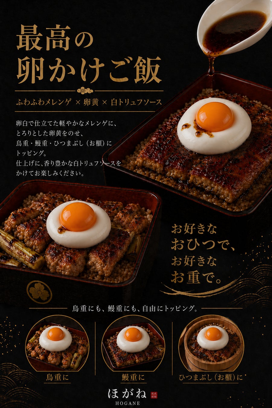 さらに、卵白で軽やかに仕立てたメレンゲ、濃厚な卵黄、白トリュフソースを合わせた「ほがね流たまごかけご飯」もご用意しています。