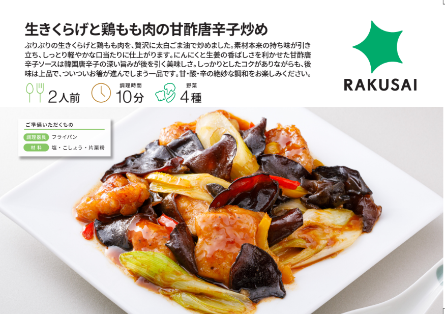 楽彩株式会社(本社:東京都足立区、代表取締役社長:大﨑善保)は、厳選されたカット済み野菜の鮮度と手軽さで支持されるミールキットブランド「RAKUSAI」より、新メニュー『生きくらげと鶏もも肉の甘酢唐辛子炒め』を2026年4月27日(月)に発売いたします。生きくらげの食感と鶏もも肉の旨みを、雑味のない「太白ごま油」で最大限に引き出したこだわりの一品です。韓国唐辛子の深いコクに、にんにくと生姜の香ばしさを効かせた特製甘酢ソースが絡み合い、食欲をそそる甘・酸・辛が重なり合う重厚でキレのある味わいを実現しました 。