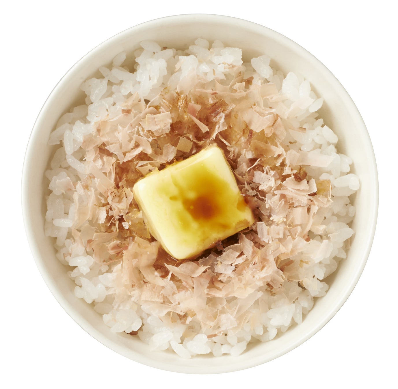 かつぶしめしに辛子明太子と海苔をトッピングしました。辛子明太子の程よい辛味と海苔の香りが、かつお節の旨みを引き立てます。プラス50円で追加できるバタートッピングはぜひお薦めしたい美味しさです。