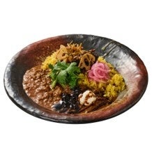 イカ墨を加え、コクと旨味を凝縮した黒カレー。食欲をそそるイカのガーリック炒めに、黒蜜とエスニックなスパイスで味付けした、ザクザク食感のフライドポテトとフライドオニオンをトッピングしました。インパクト抜群の「イカ墨スパイス黒カレー」をぜひお楽しみください。