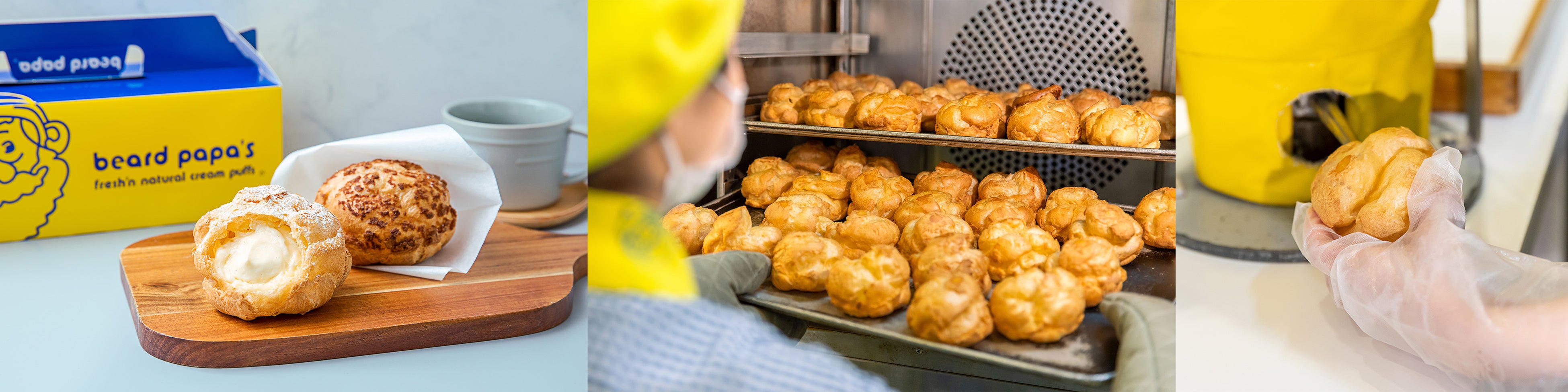 ビアードパパは、お店で手作りのシュークリーム専門店。シュー生地は常にオーブンで焼き上げ、クリームは新鮮な状態を保つため毎日お店で手作りしています。お口に入れた瞬間のサクッとした食感、トロ〜リなめらか舌触り。そして、食べた人の最高の笑顔。私たちは、そんな“美味しさの幸せ”をお届けしたくて、素材や製法にいくつものこだわりを持っています。