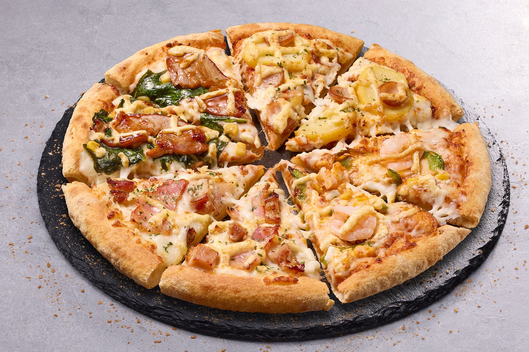 ぷりぷり食感のエビを使用したマヨシュリンプ、ジューシーなチキンがたまらないマヨチキン、テリヤキソースとチキンが相性抜群な炭火焼チキテリ、ほくほく食感のポテトがおいしいマヨじゃがの4種類が1枚で楽しめる商品。すべての味に、ドミノ・ピザ特製のマヨソースを使用しています。お子さまから大人まで、みんなが大好きなマヨソース×ピザの味わいを存分にお楽しみいただけます。