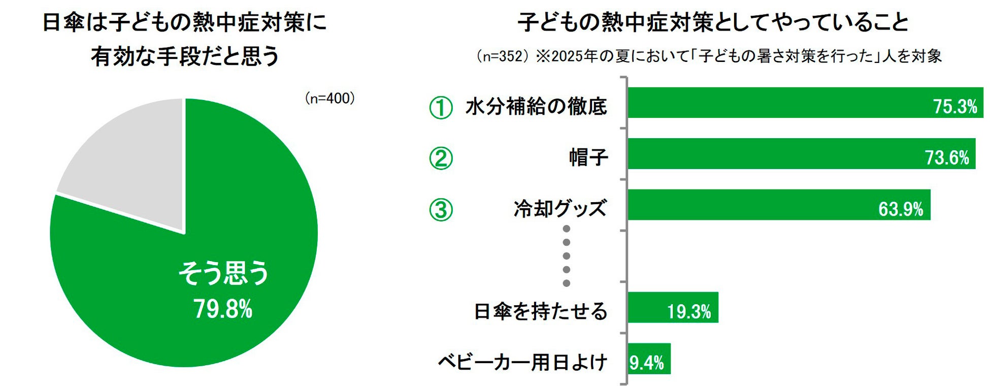 熱中症対策では、こまめな水分補給に加え、「暑さから逃げる」行動が重要です。日傘は、直射日光を遮る「持ち歩ける日陰」として、体温上昇を抑える効果が期待でき※7、熱中症対策として有効な選択肢の一つです。調査でも、約8割(79.8%)が「日傘は子どもの熱中症対策に有効だと思う」と回答しました。一方で、「子どもに日傘を持たせている」と回答した人は2割以下(19.3%)にとどまりました。このことから、日傘の機能については一定の認知がある一方で、子どもの熱中症対策としての日傘の活用は、まだ十分には広がっていないことが分かりました。
