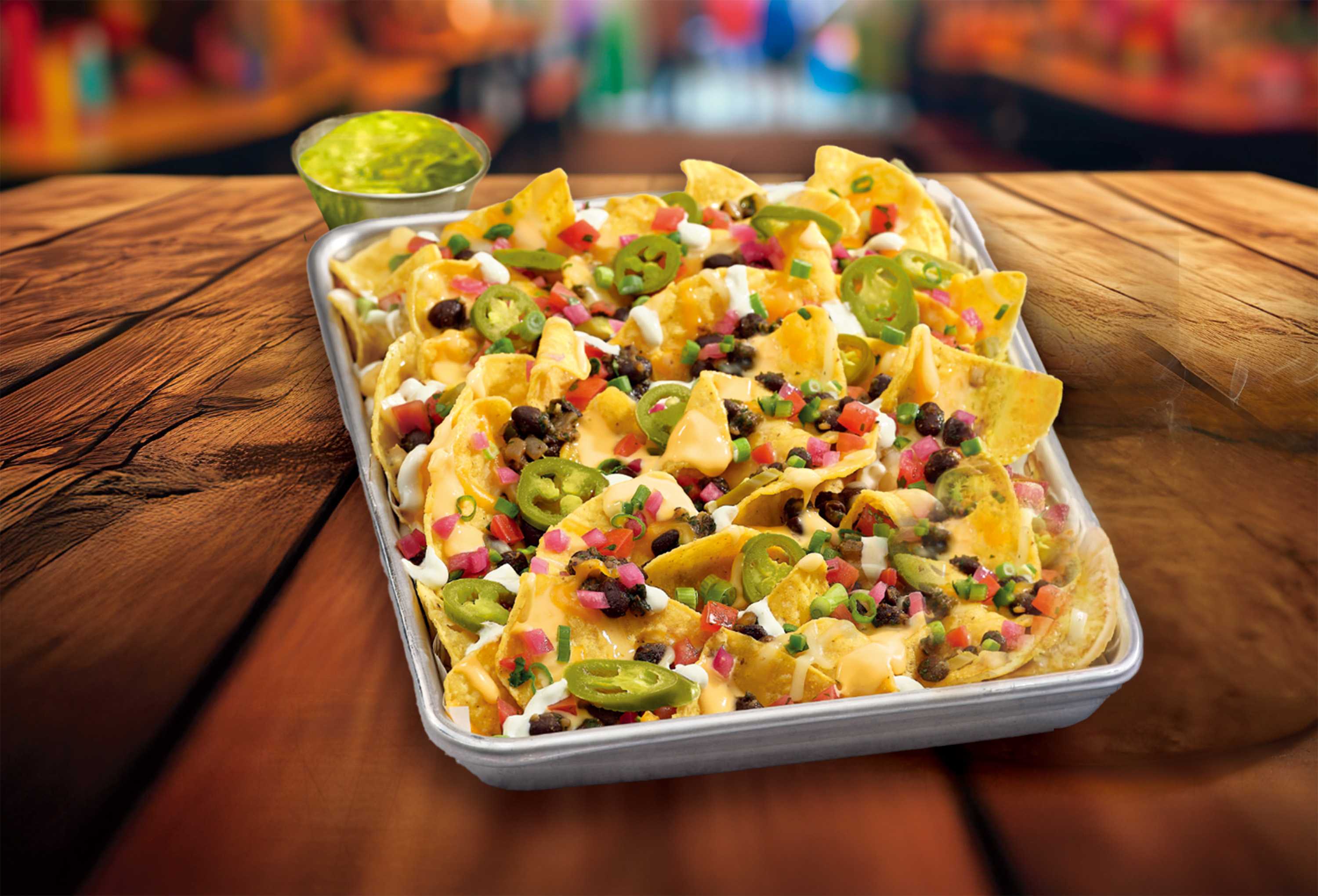 コーンチップスにブラックビーンズ、チーズソースをのせて焼き、ピコデガロ、 ハラペーニョ、レッドオニオンピクルス、グリーンオニオン、ライムクリームをトッピング。ワカモレディップ付き。