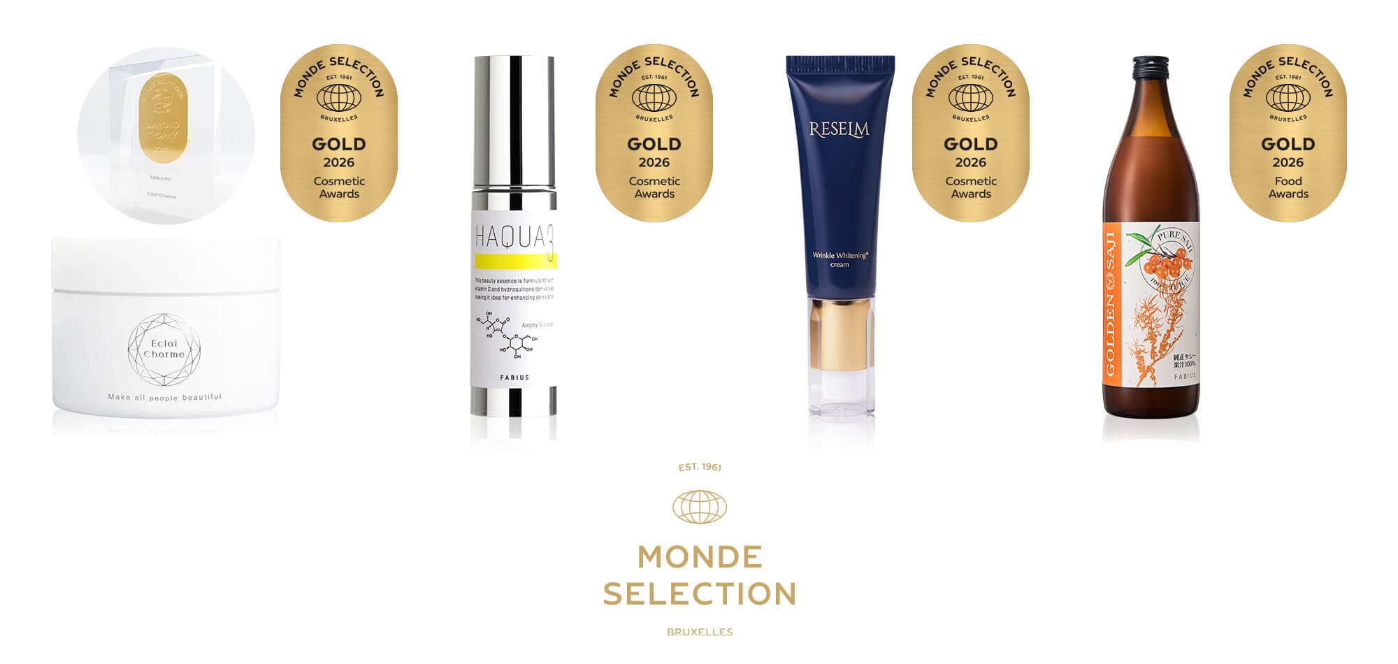 「すべての人を美しく」を掲げて化粧品・健康食品を展開するファビウス株式会社(本社:東京都渋谷区、代表取締役社長:濱﨑恵子)は、厳正かつ公正な審査プロセスで知られ、世界的な品質評価指標である「モンドセレクション2026」において、「エクラシャルム」「ハクアスリー」「リセルム」「ゴールデンサジー®(純正サジー)」の4商品が同時に金賞を受賞いたしました。