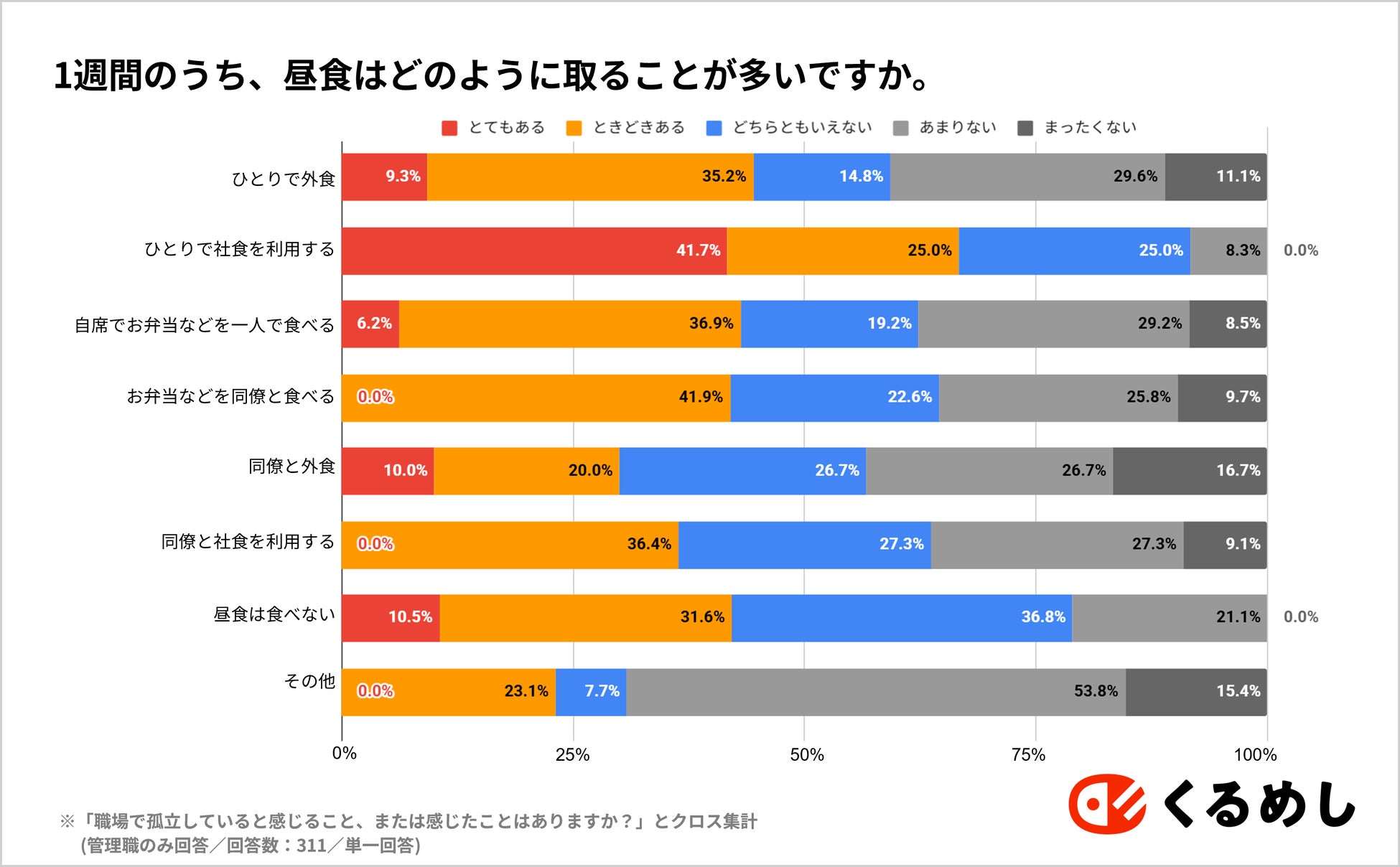 管理職の回答では、それぞれ「ひとりで外食(44.5%)」「ひとりで社食を利用する(66.7%)」「自席でお弁当などを一人で食べる(43.1%)」で全体よりもさらに割合が高いことが判明しました。多忙な管理職は、ひとりで短時間での昼食をとることが多いのかも知れません。