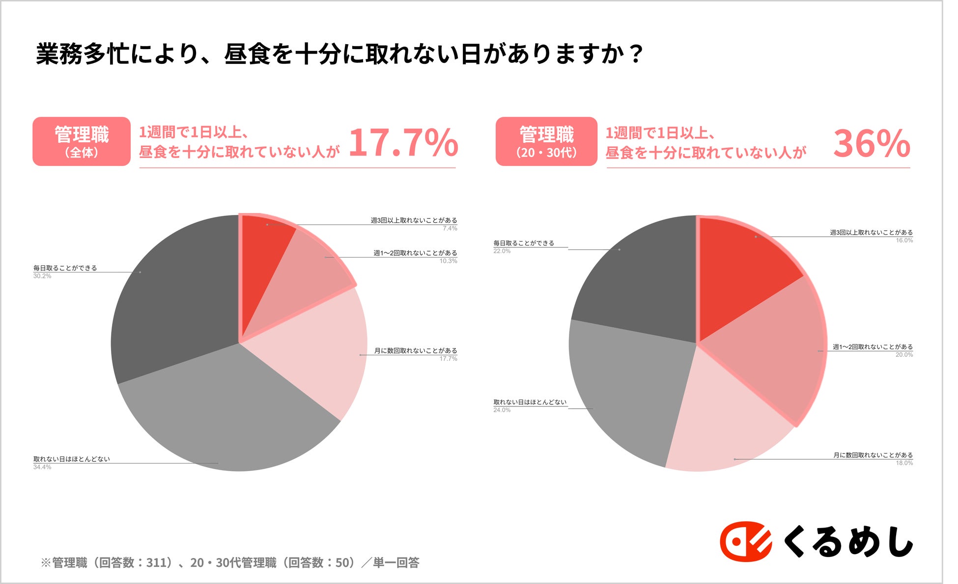 5.2%が「1週間のうち、週3回以上昼食を取れないことがある」と回答しています。20・30代管理職に回答を絞ると、16%の人が「週3回以上昼食を取れないことがある」と言っています。