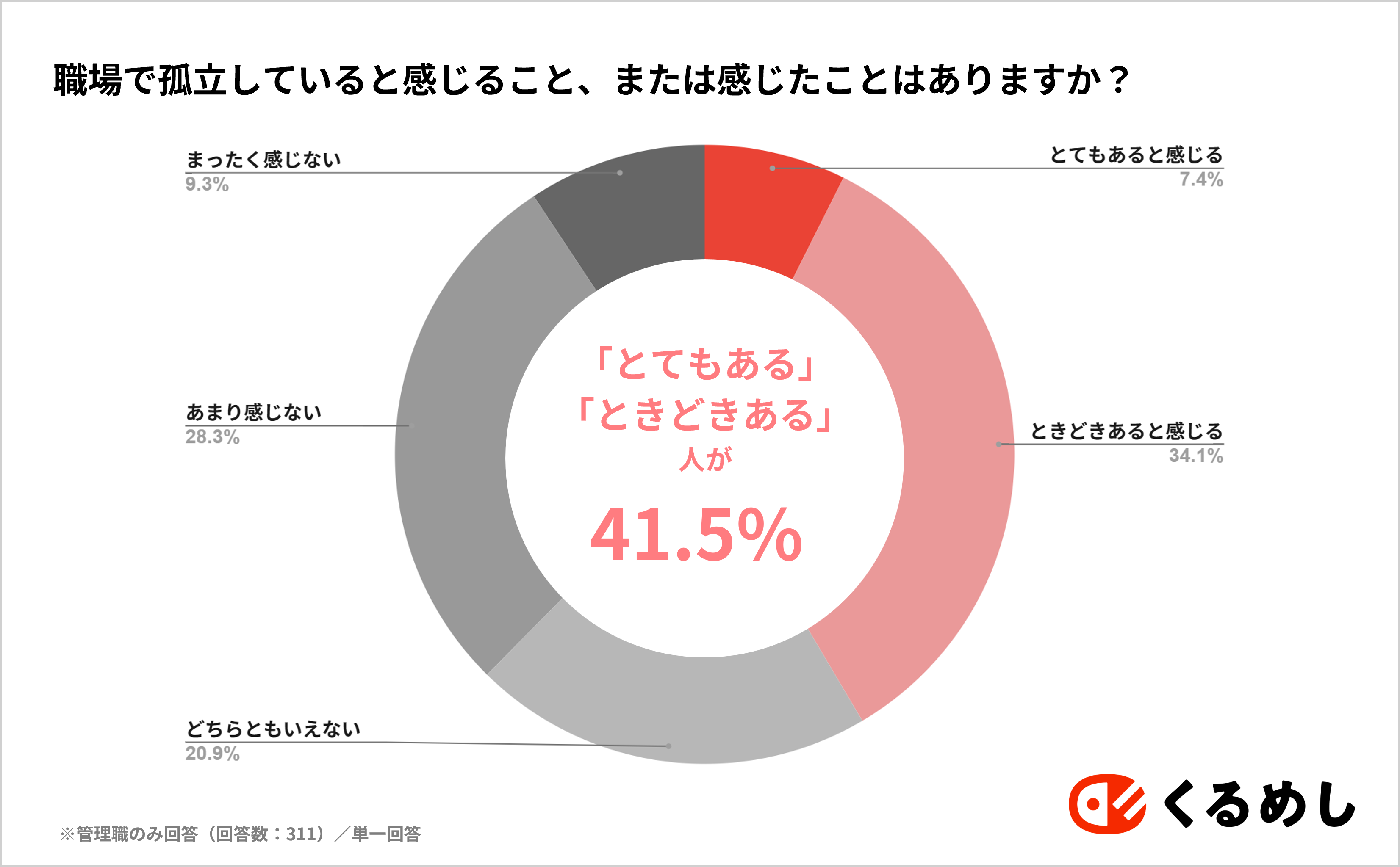 – 管理職では41.5%、中でも20・30代の管理職は36%、40・50代の管理職で43.5%が孤立を感じている