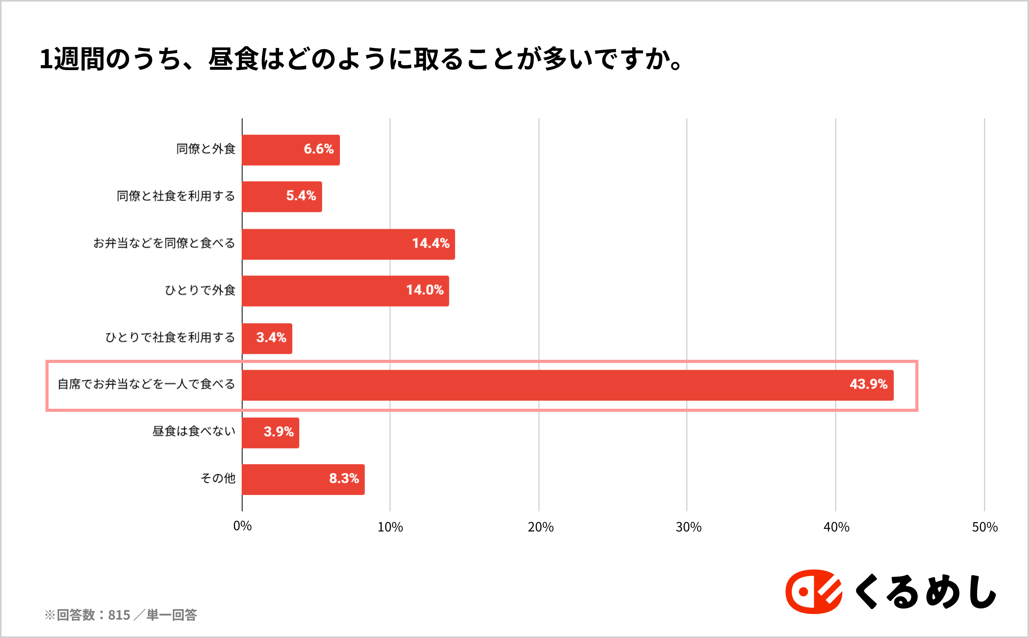 「1週間のうち、昼食はどのように取ることが多いですか」という質問に対し、61.3%が「昼食をひとりでとる」という回答でした。内訳としては、「ひとりで外食(14%)」「ひとりで社食を利用する(3.4%)」「自席でお弁当などを一人で食べる(43.9%)」となり、自席で食べている人が半数近くに上ることがわかりました。