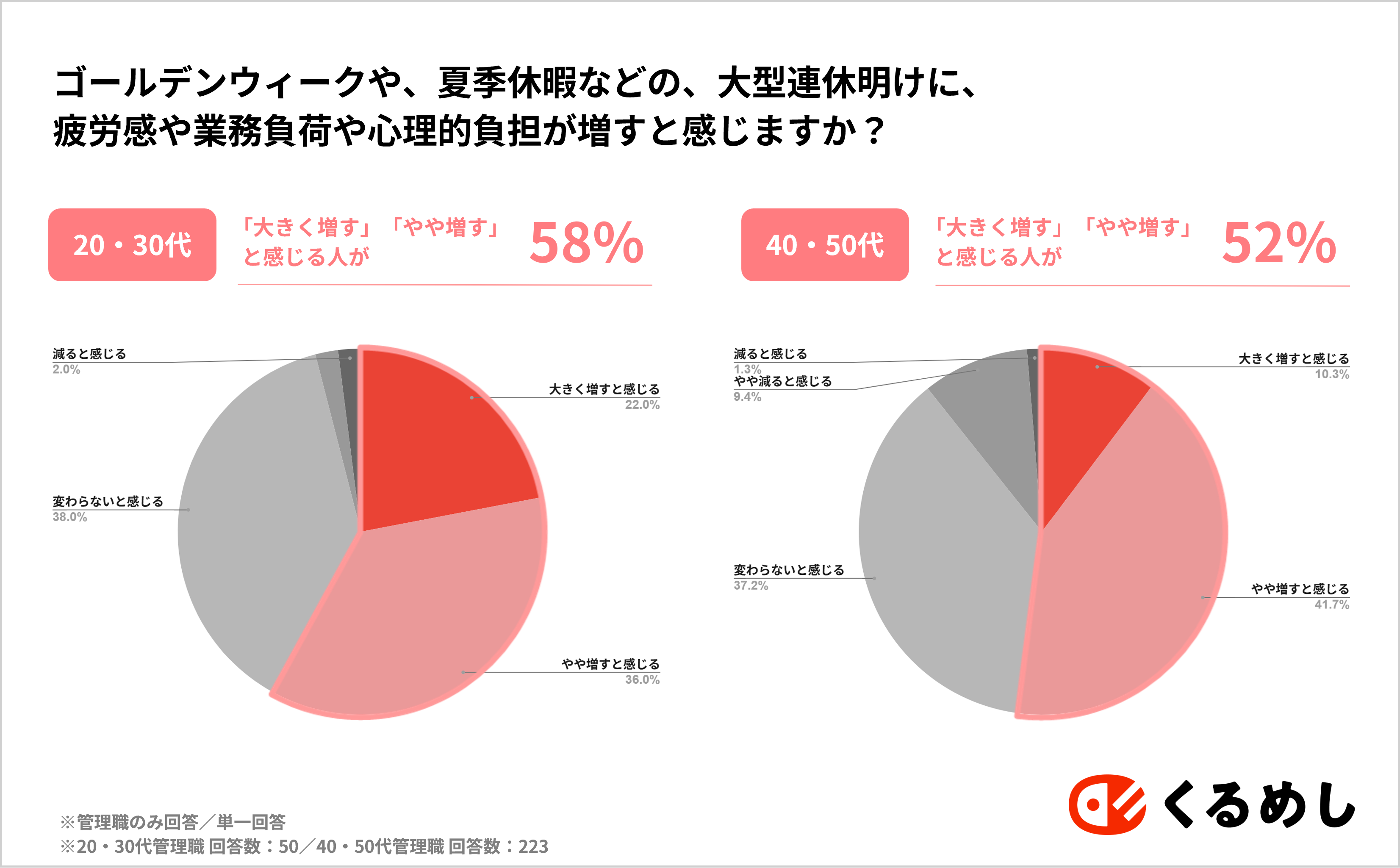 – 管理職では51.8%、中でも20・30代の管理職は58%、40・50代の管理職で52%が疲労感・業務負荷・心理的負担が増すと回答