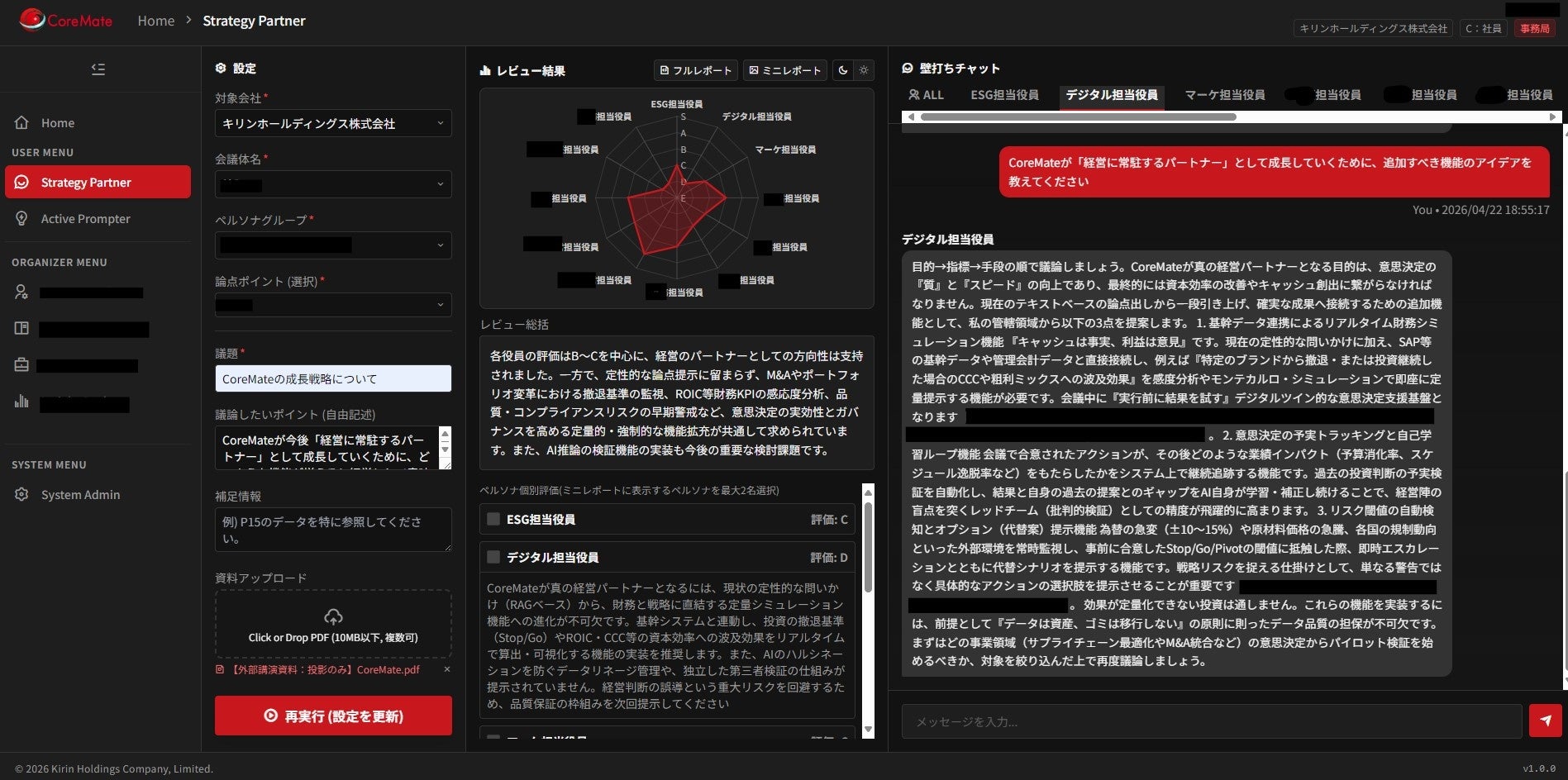 キリンホールディングス株式会社(社長COO 南方健志)は、「KIRIN Digital Vision2035」に基づき、経営層の意思決定を支える右腕として、「AI役員 CoreMate(以下、CoreMate) 」を2025年7月からキリングループの経営戦略会議に導入しています。※1今回、2026年4月にキリンビール株式会社、キリンビバレッジ株式会社などグループ事業会社の経営戦略会議においても導入を開始し、多様な視点を取り入れることで、イノベーションを通じた価値創造をさらに加速させます。