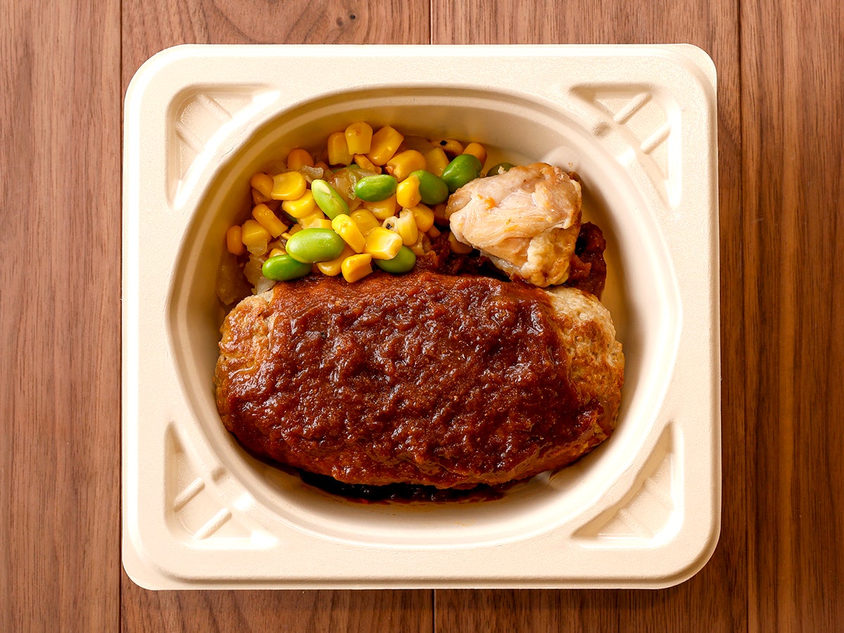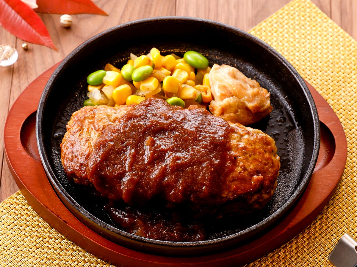 今回新登場する「濃厚デミソースのBIGハンバーグ」は、170gの肉厚ハンバーグとグリルチキンを盛り合わせた、ボリューム満点の一皿です。洋風だしで野菜の旨みを重ねた特製デミグラスソースをたっぷりとかけ、粗挽きブラックペッパーでプレート全体の味を引き締めました。また、彩り野菜の枝豆、スイートコーン、玉ねぎが食感と甘みのアクセントとなっています。肉の旨みを存分に楽しめる、食べ応え抜群の満腹メニューです。