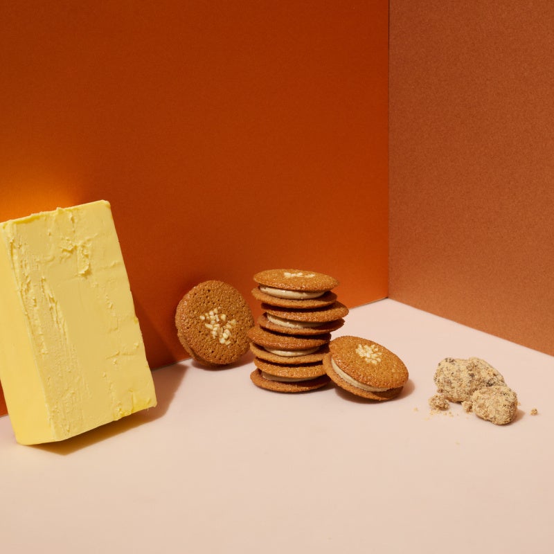 バターと黒糖で仕立てたサクサクのチュイールで、やさしい甘さの黒糖チョコレートをサンドしました。仕上げにアーモンドをあしらい、香りと食感をプラスしました。