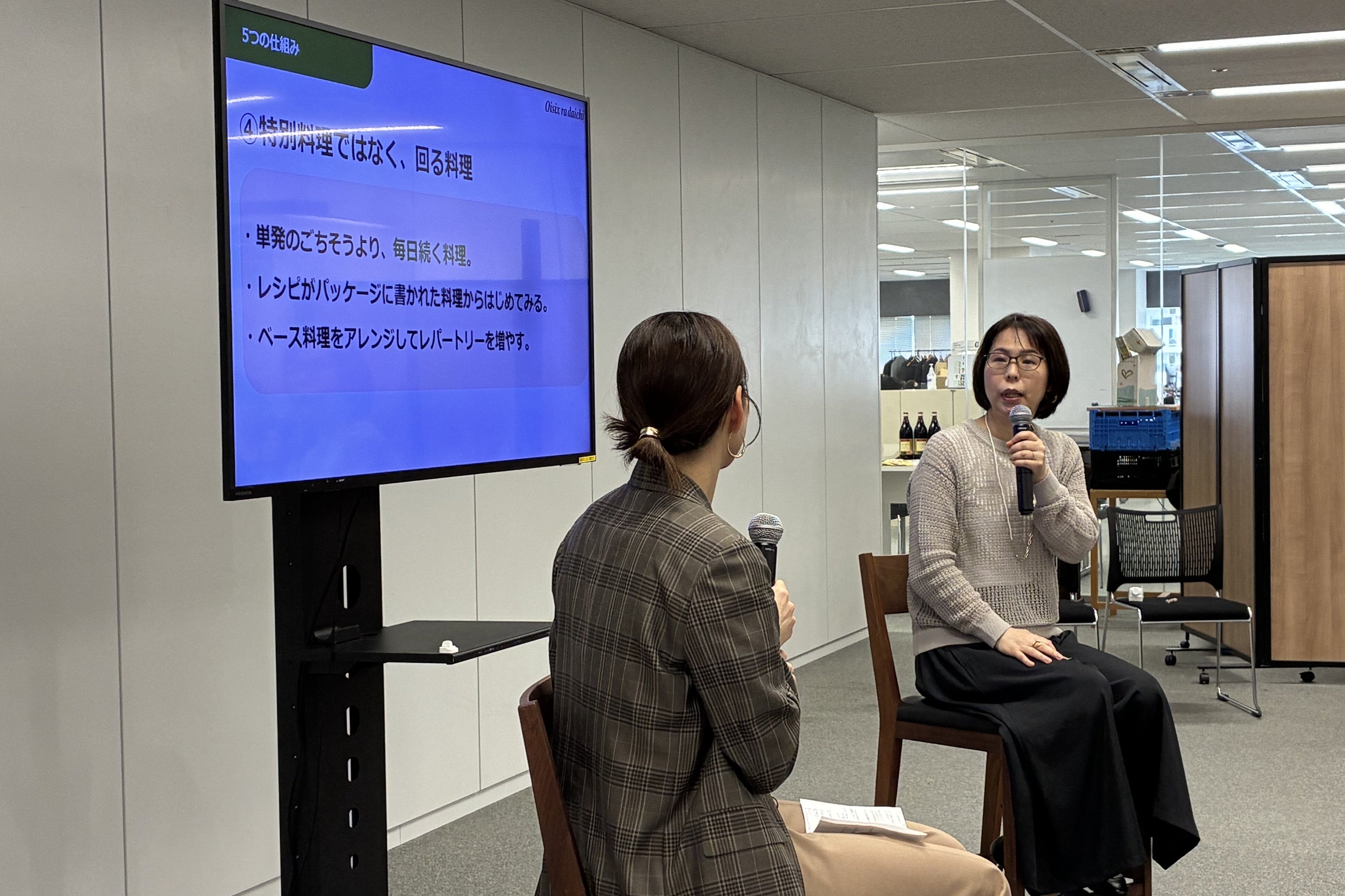 復職直後は「完璧にこなせない自分」への罪悪感や、自分のケアを後回しにする孤立感が課題になりがちです。そこで、がんばりすぎない「完璧主義」からの解放をテーマに、知的家事プロデューサー・本間朝子氏と、2度の復職を経験し、現在は「デリOisix」のプロジェクトマネージャーを務める当社社員・荒川桃子とのトークセッションを実施しました。