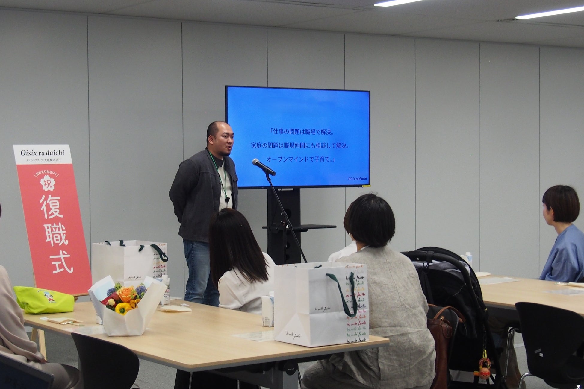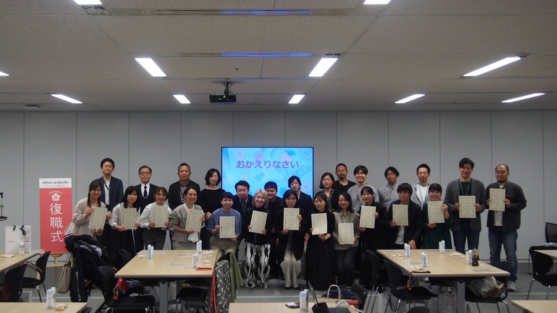 食品のサブスクリプションサービスを提供するオイシックス・ラ・大地株式会社(本社:東京都品川区、代表取締役社長:高島 宏平、以下 当社)は、育児休業を終え復職する社員を対象に「復職式」を2026年4月24日(金)に実施しました。本取り組みは2017年から毎年実施しており、今回は10回目の節目を迎えました。今年は初めて2部構成で開催し、1部では復職証書の授与や、無理しがちな復職後に向けて、あえて“頑張らないこと”を発表する【これは「頑張りま宣言」】などを実施したほか、2部では復職後の心理的負担軽減をテーマに、専門家と当社社員によるトークセッションを行いました。
