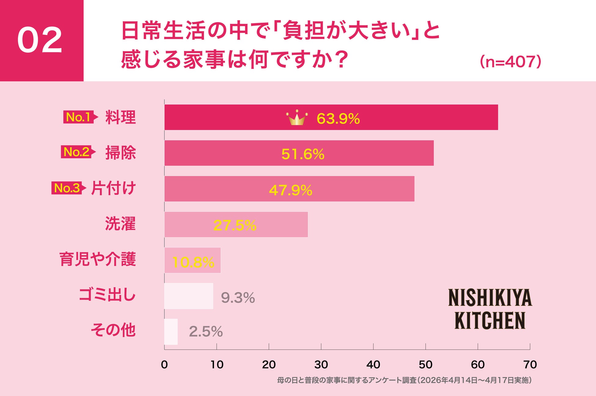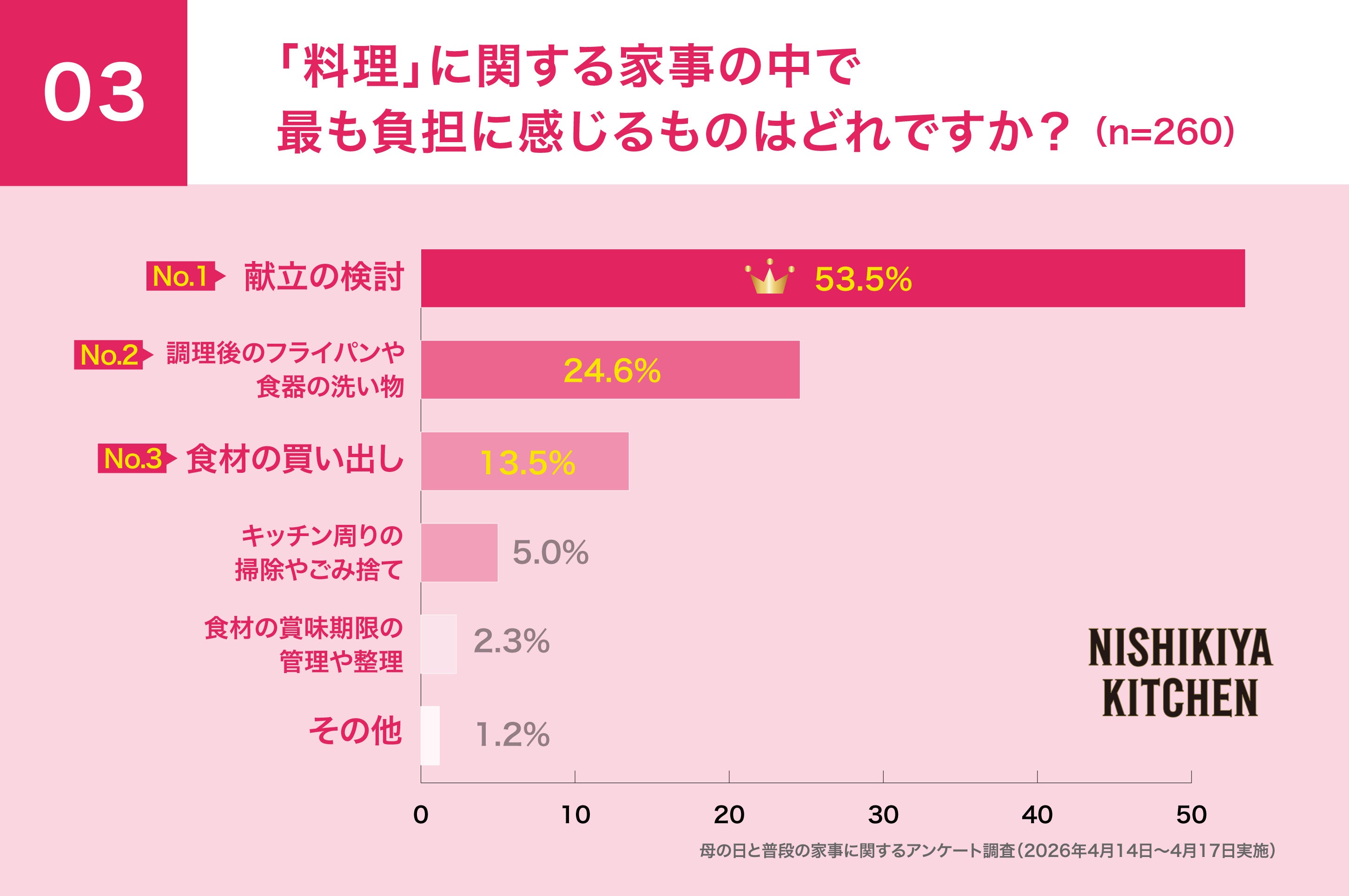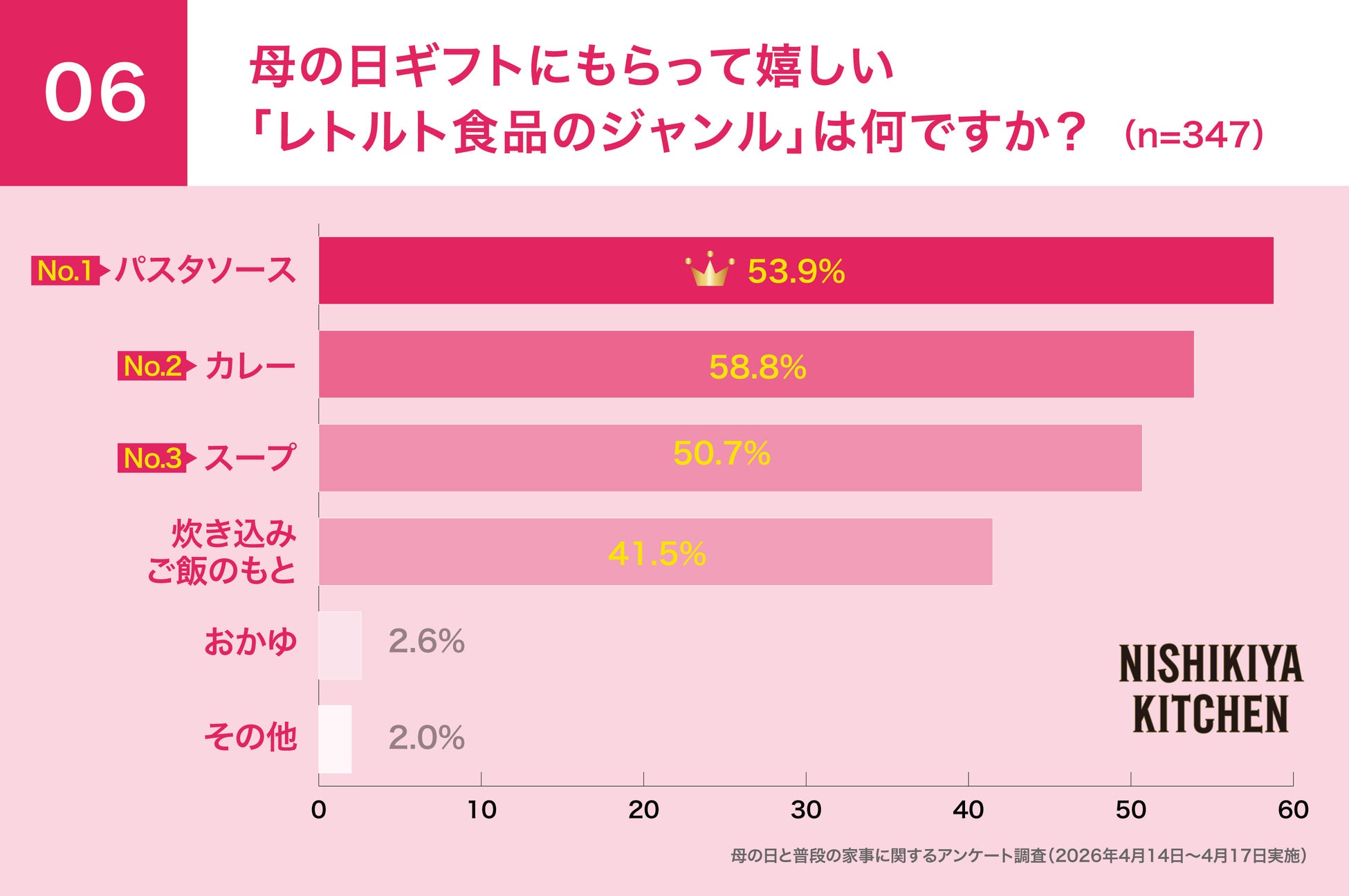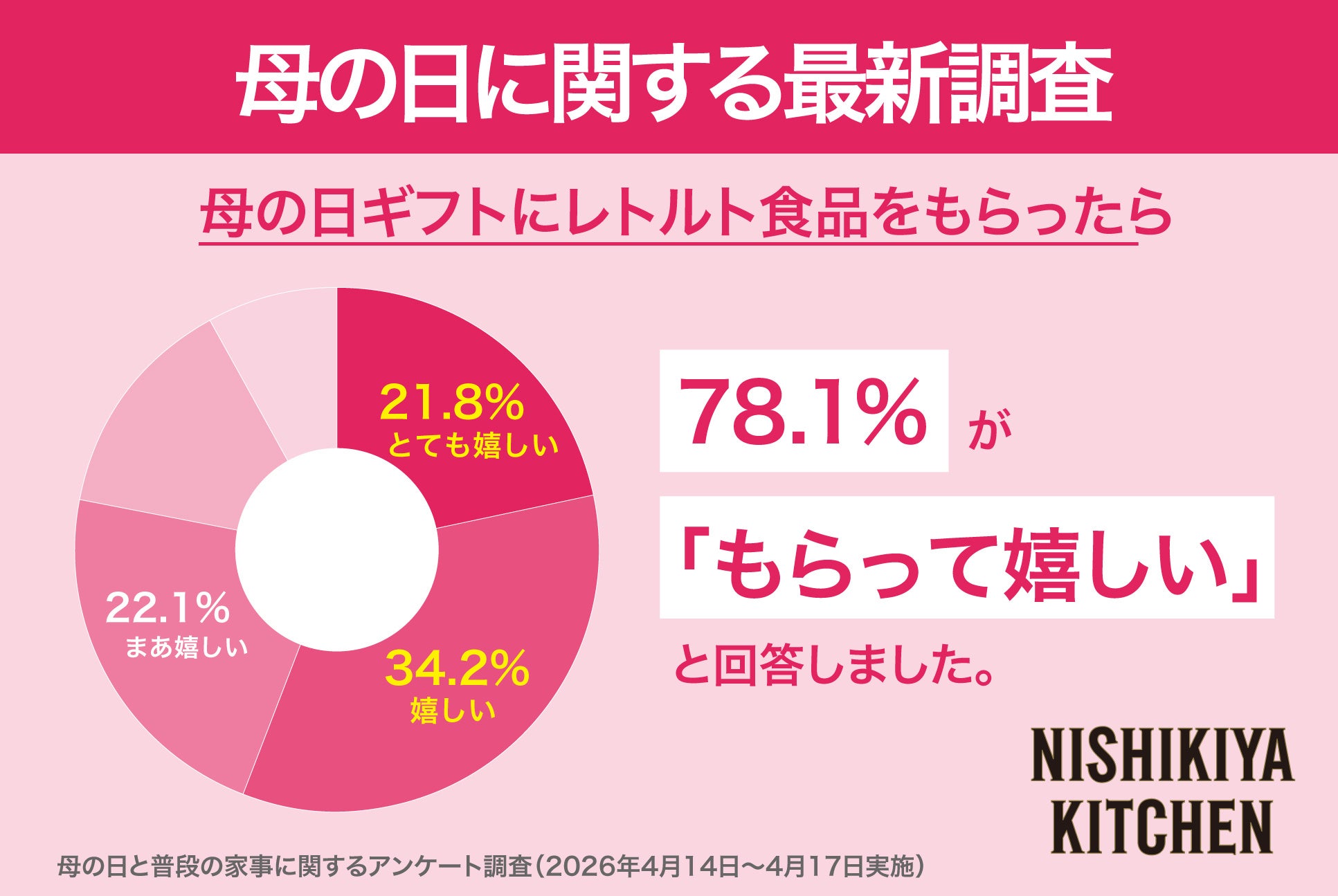 「世界の料理を『カンタン』に。」をコンセプトに掲げ、レトルトカレーを中心に約120種類のレトルト食品を販売する専門店NISHIKIYA KITCHEN(ニシキヤキッチン)(株式会社にしき食品 本社:宮城県岩沼市、代表取締役社長:菊池洋一)は、インターネットリサーチで2025年に母の日ギフトをもらったことがある30〜70代の女性444人を対象に、母の日と普段の家事に関する意識調査を実施しました。調査の結果、料理に関する家事の中で、2人に1人が、最も負担に感じるものは「献立の検討」という実態が浮き彫りとなりました。一方で母の日ギフトとして「レトルト食品をもらったら嬉しい」と答えた人が78.1%であることが判明しました。「料理の献立を考える」ことが課題である中、食卓の主役となりそれだけで一食が成立する「レトルト食品」が新定番ギフトとして評価されています。