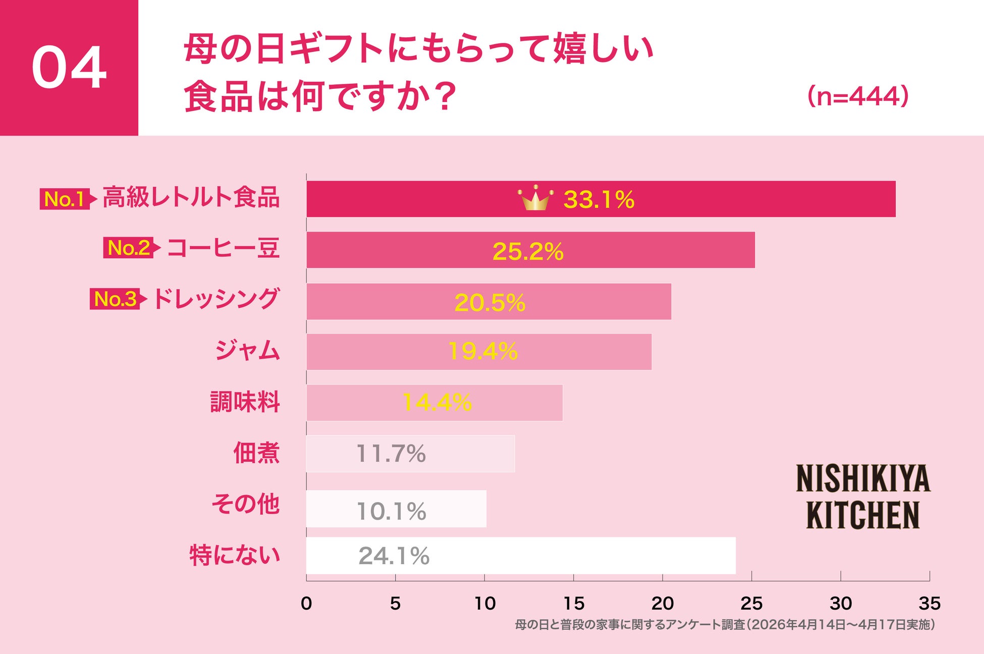 一方で母の日ギフトにもらって嬉しい食品を尋ねたところ「高級レトルト食品(33.1%)」が最も高く「コーヒー豆(25.2%)」、「ドレッシング(20.5%)」と続きました。