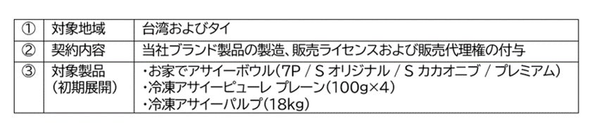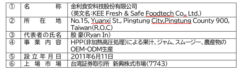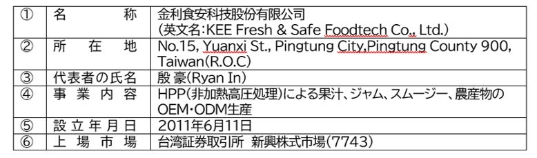 当社は、台湾の食品メーカーである金利食安科技股份有限公司(KEE Fresh & Safe Foodtech Co., Ltd.、以下「KFS社」)との間で、台湾およびタイ市場における当社ブランド製品の製造・販売ライセンスならびに販売代理に関する基本合意書(MOU)を締結いたしましたので、下記のとおりお知らせいたします。