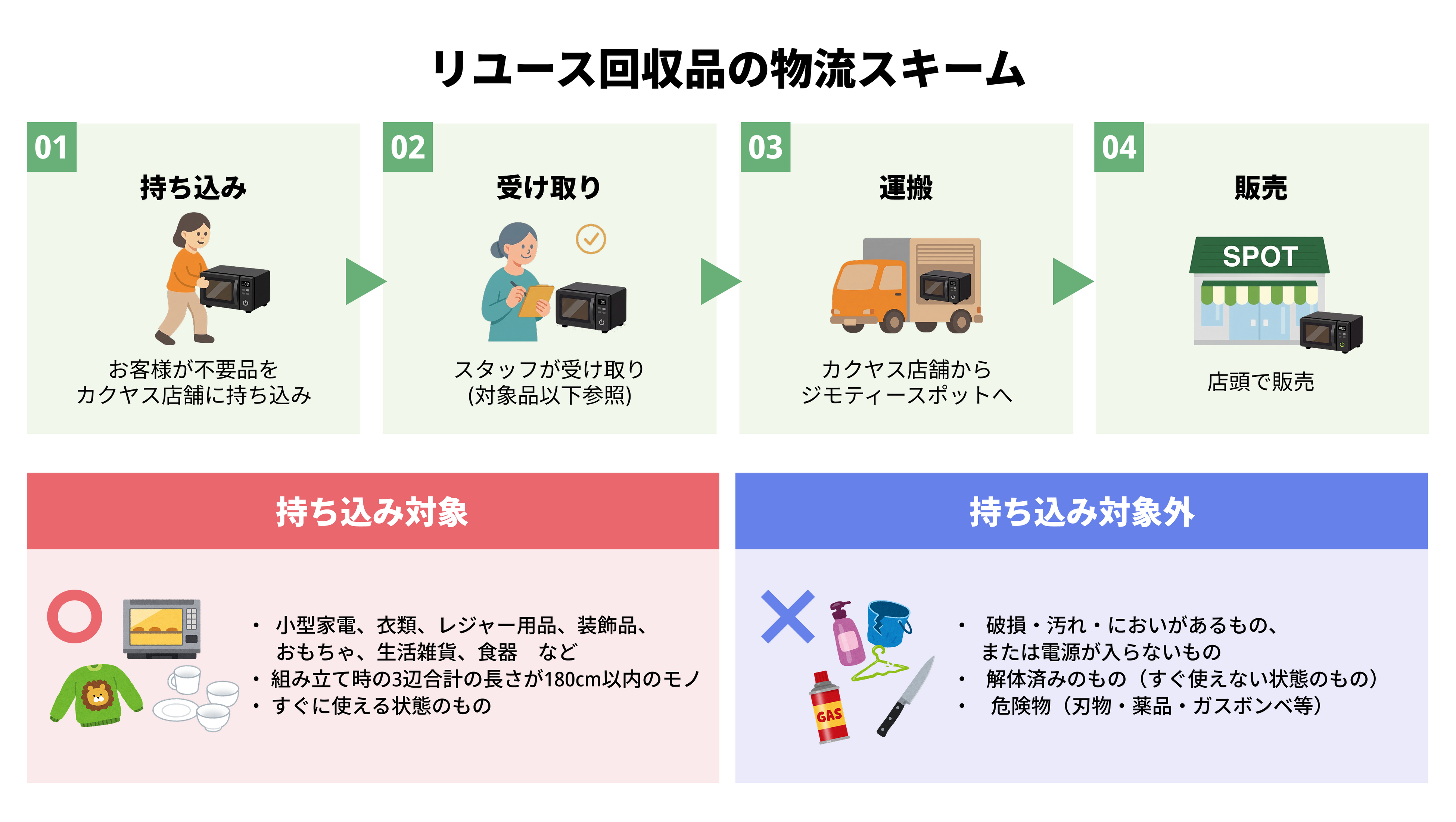 なんでも酒やカクヤスの横浜市内2店舗に家庭の不要品を無償で持ち込める「ジモティースポットミニ」を設置し、不要品の回収拠点を大幅に拡充します。持ち込まれた不要品は、各店舗でスムーズに受付可能な独自の仕組みを利用し、既存の酒類配送の戻り便を活用して効率的にジモティースポットへ移送、リユース品として販売されます。