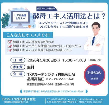 Dashi Corporation株式会社(本社:東京都品川区、代表:水野 勉)の子会社であるDashi Trading株式会社(本社:東京都品川区、代表:水野 勉)は、世界トップブランドであるエンジェルイースト社(正式名称:安琪酵⺟股分有限公司)と共催し、酵母エキスについて学ぶ無料セミナーを2026年5月26日(火)に開催いたします。