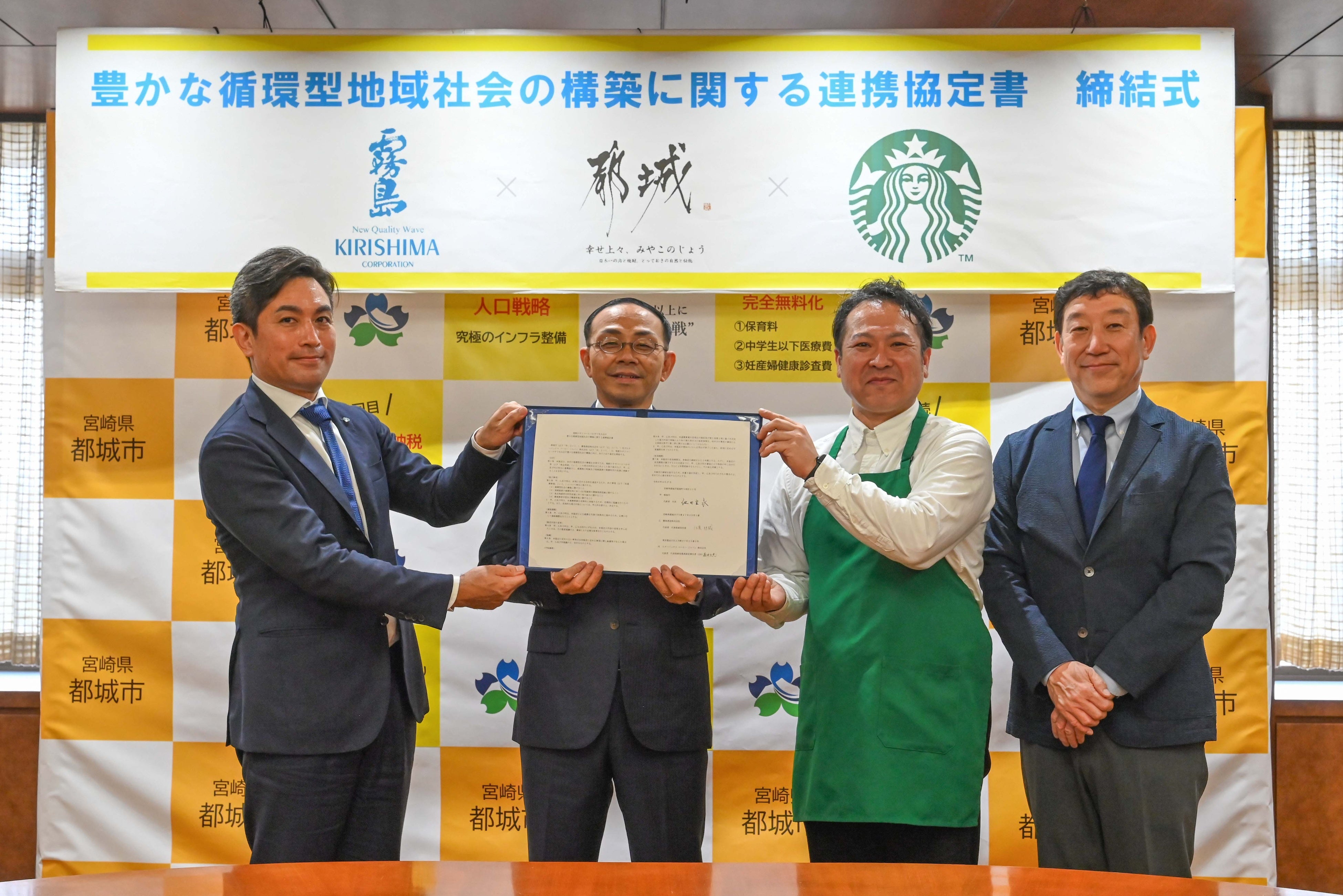 スターバックス コーヒー ジャパン 株式会社[本社:東京都品川区、代表取締役 最高経営責任者 CEO:森井久恵]と宮崎県都城市、および霧島酒造株式会社は、2026年4月27日(月)に「コーヒーかす」と「焼酎かす」を活用した循環型地域社会の構築に向け連携協定を締結いたしました。今後は、「コーヒーかす」や「焼酎かす」からできるバイオガスを地域のエネルギーとして利用するなど、資源循環をはじめとした取り組みにおいて3者で連携し、都城市の循環型社会の構築を目指します。