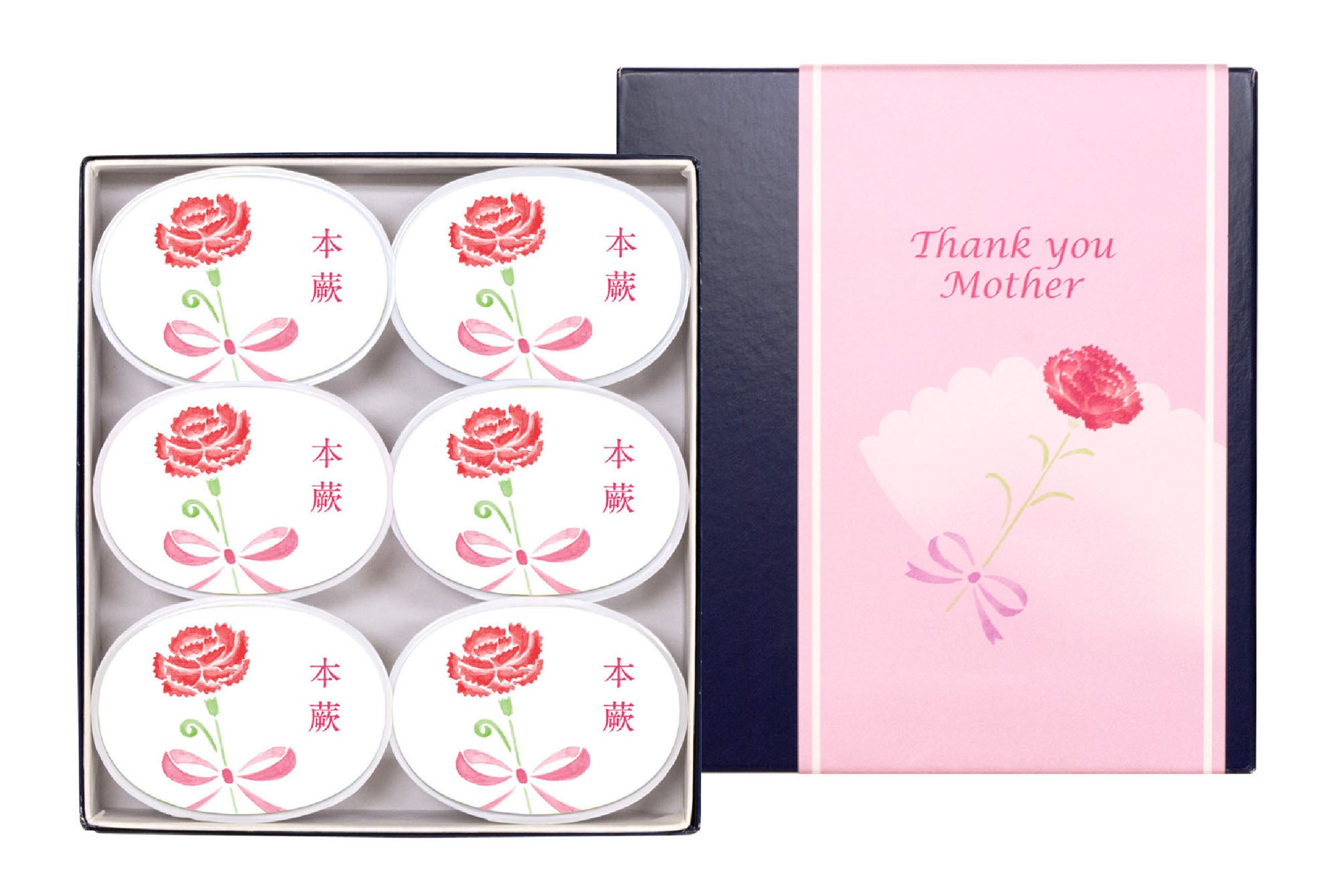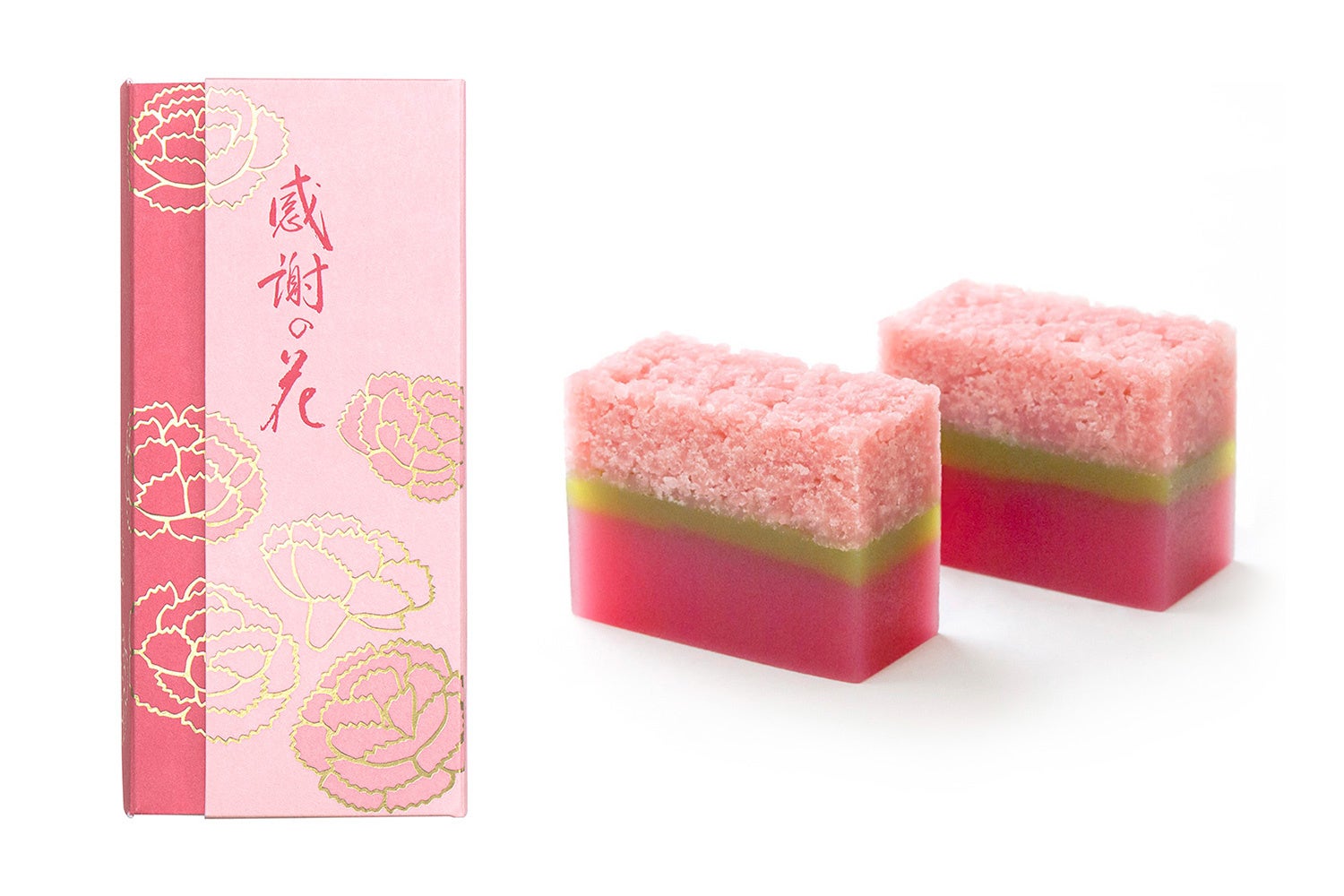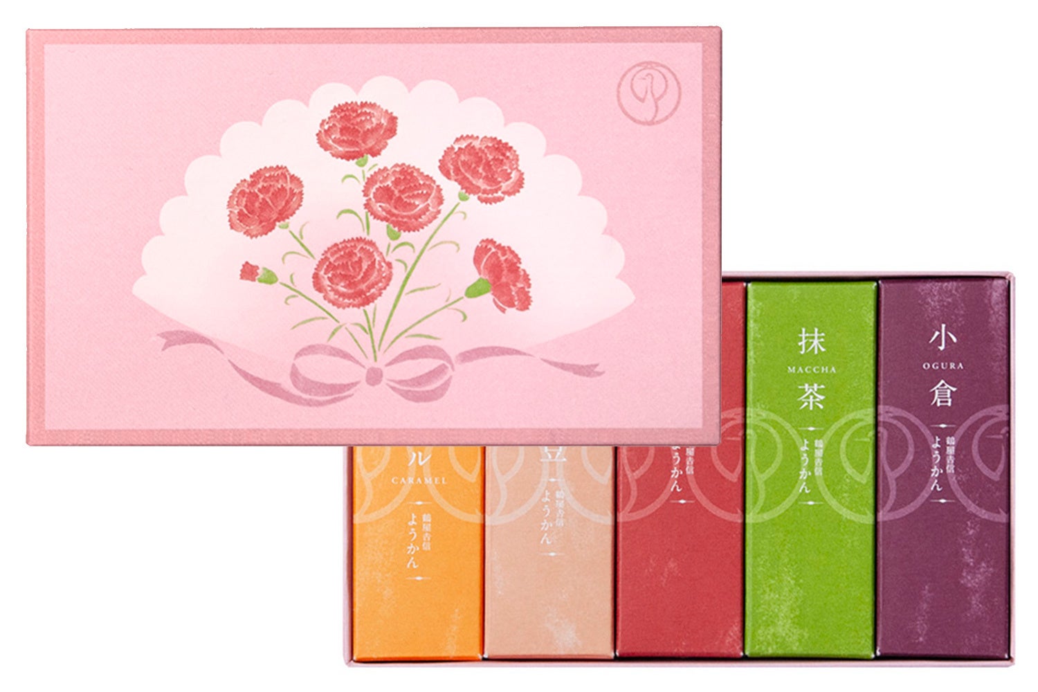 お手軽にお楽しみいただける人気のミニ羊羹3種を、カーネーションの花束の意匠をあしらった母の日限定BOXにお詰合せいたしました。