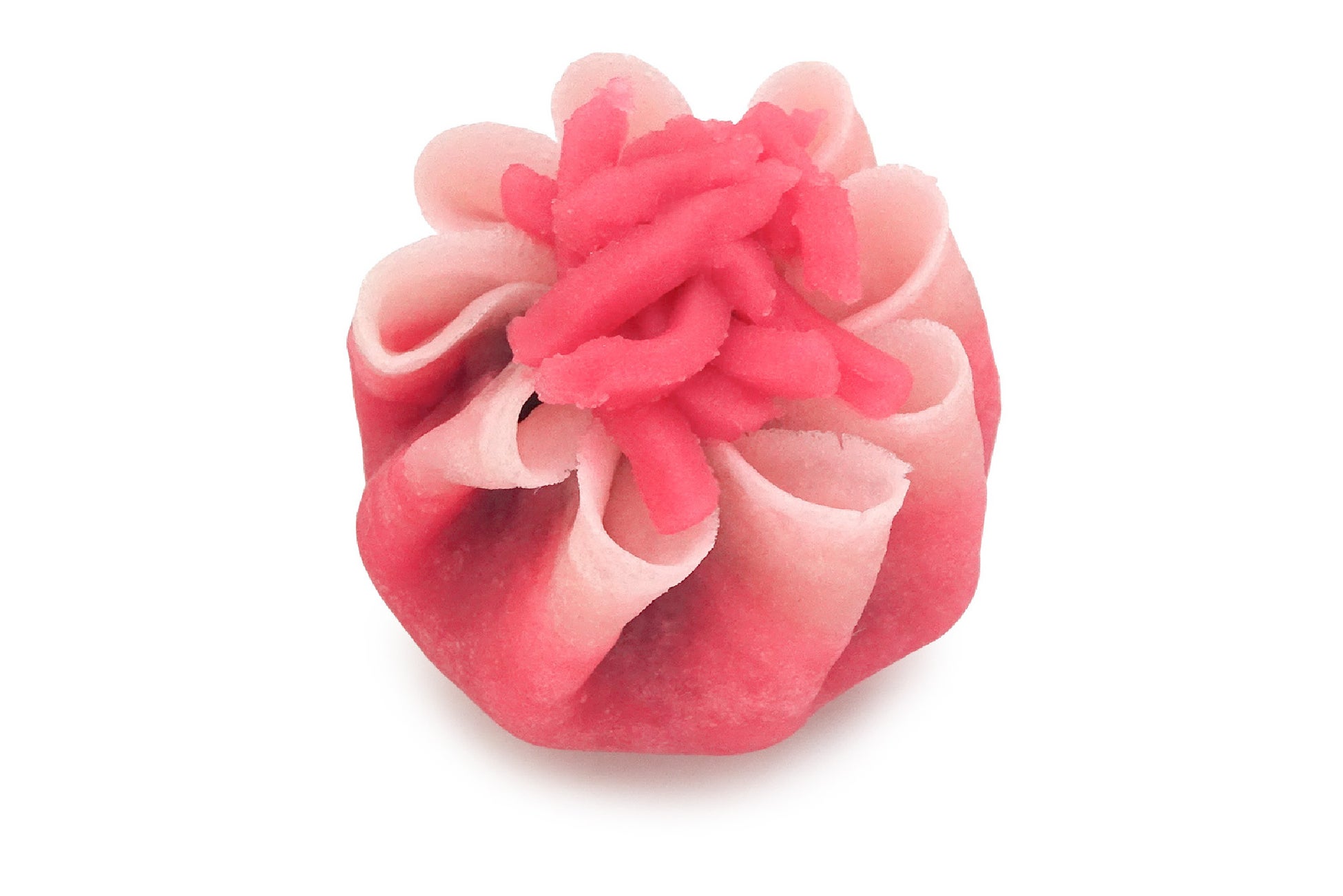 母の日にちなみ、カーネーションをピンクの焼き皮ときんとんで表現いたしました。花びらをあらわす丁寧にたたまれた焼き皮の中には、粒あんを包んでいます。