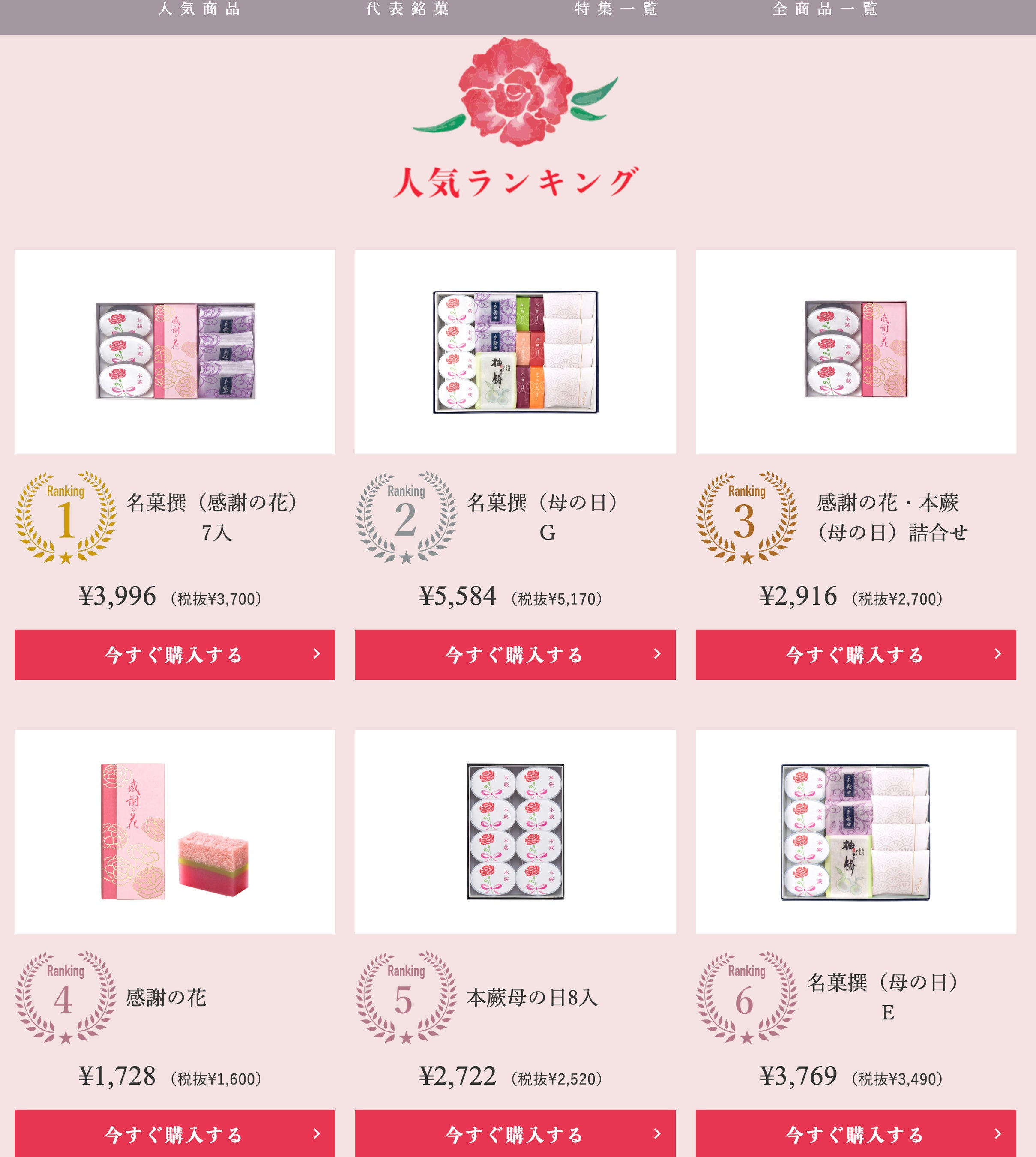 オンラインショップの特設ページでは、鶴屋吉信の「母の日」和菓子の人気ランキングも更新中です。贈りものに迷ったときに、ぜひ一度ご覧ください。