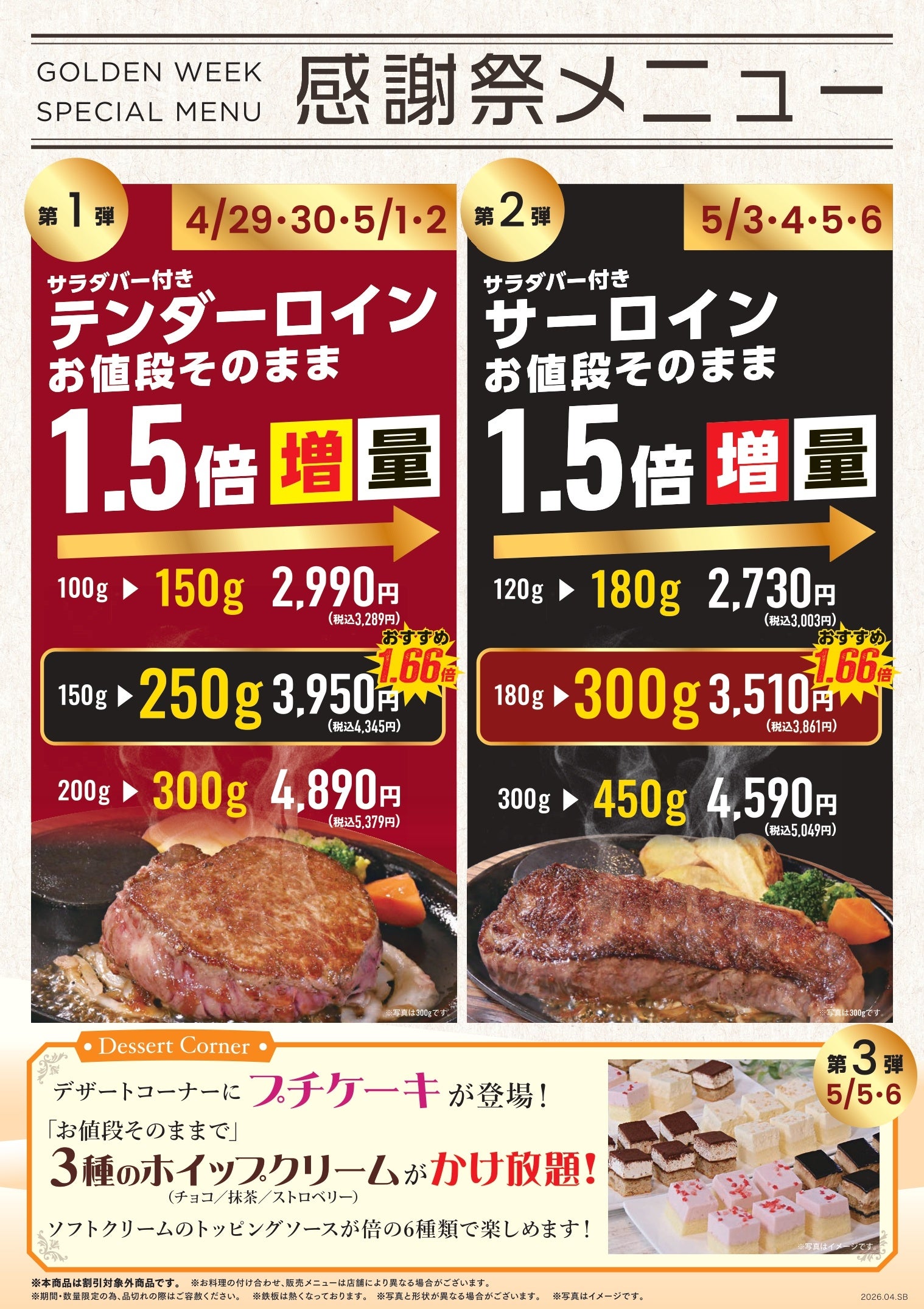 GW期間中、第1弾はテンダーロイン、第2弾はサーロインをお値段そのまま増量、第3弾はプチケーキとトッピング充実のデザート企画を実施