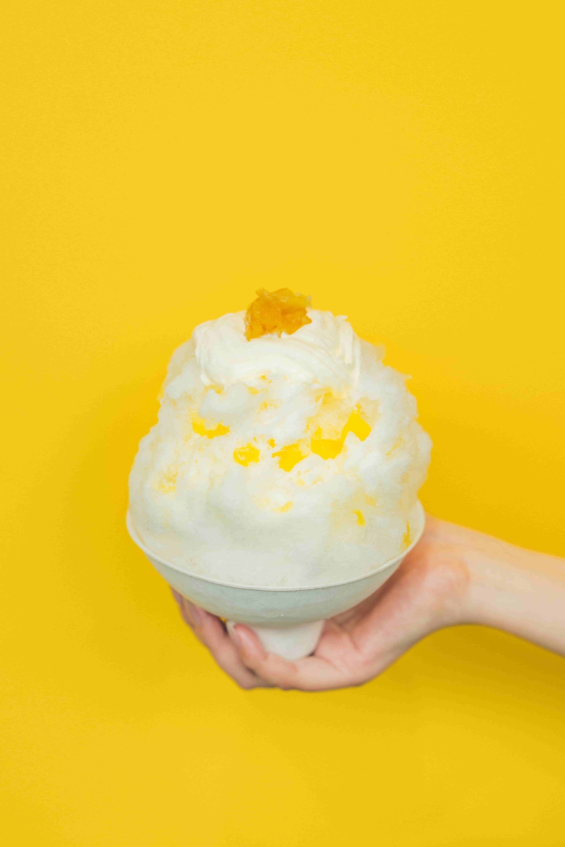 氷の中にはなめらかなソフトクリームを忍ばせ、練乳・湘南ゴールドとレモンのシロップを重ねた三層仕立て。食べ進めるごとに味の変化を楽しめます。