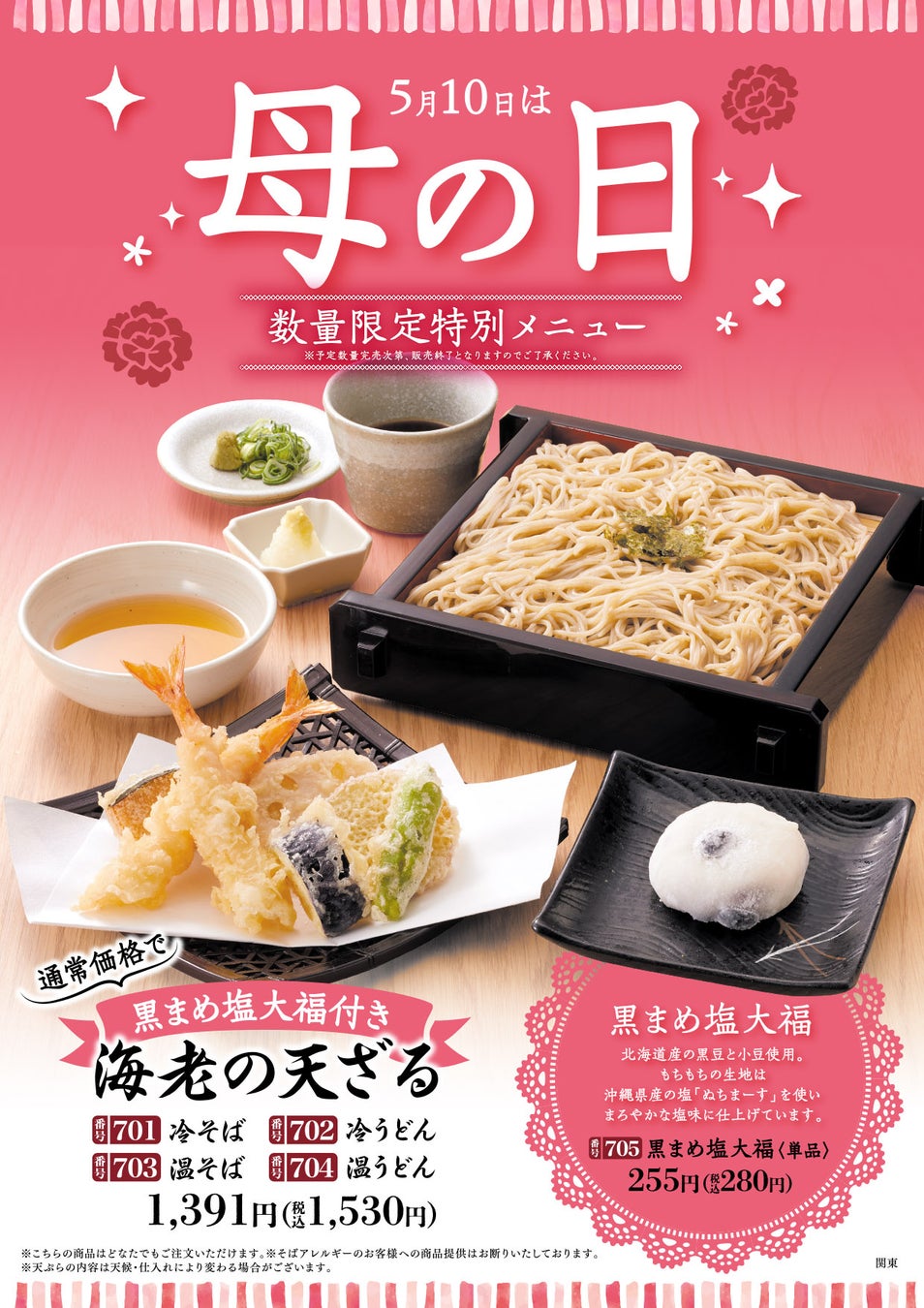 メインとなるのは、プリッとした海老の天ぷらを盛り合わせた「海老の天ざる(そば/うどん)」に、北海道産黒豆と国産小豆を使用した黒まめ塩大福を添えた、数量限定のセットメニュー。食後までやさしい余韻を楽しめる、母の日ならではの一品です。