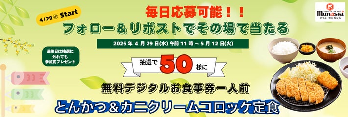 あわせて2026年4月29日(水)午前11時~2026年5月12日(火)の期間に「宮本むなし公式Xフォロー&リポストキャンペーン」を実施いたします。宮本むなしの公式Xアカウントをフォローし、キャンペーン投稿をリポストすることで期間中毎日応募でき、その場での抽選で定食屋宮本むなし店内で「とんかつ&カニクリームコロッケ定食」(1,150円税込)1人前をお召し上がりいただけるデジタルお食事券が当たるキャンペーンです。ぜひこの機会に宮本むなし公式Xのフォロー&リポストでのご参加をお待ちしております。