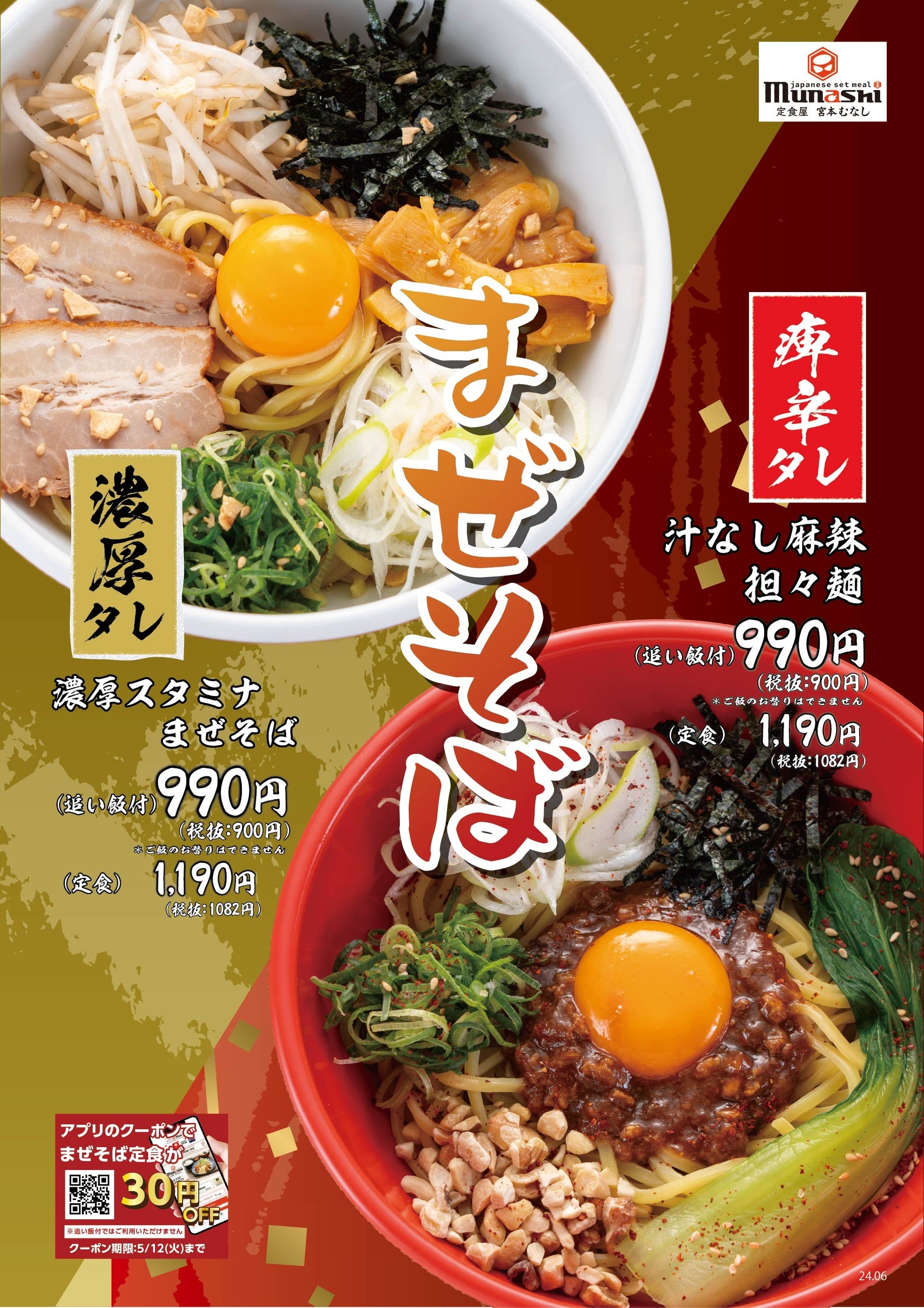 宮本むなし公式アプリでは、5月12日まで何度でも使える「まぜそば定食 各種30円引きクーポン」を配信いたします。会員の方限定でご利用いただけるクーポンですので、この機会にぜひ宮本むなし公式アプリをダウンロード&会員登録ください。