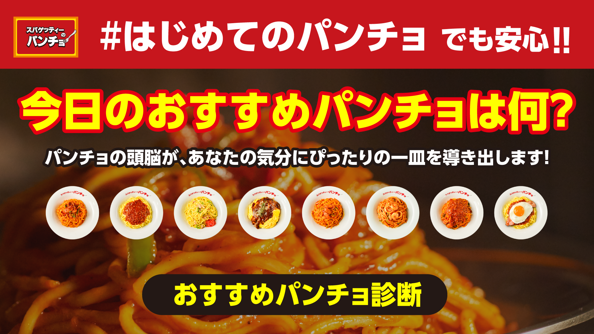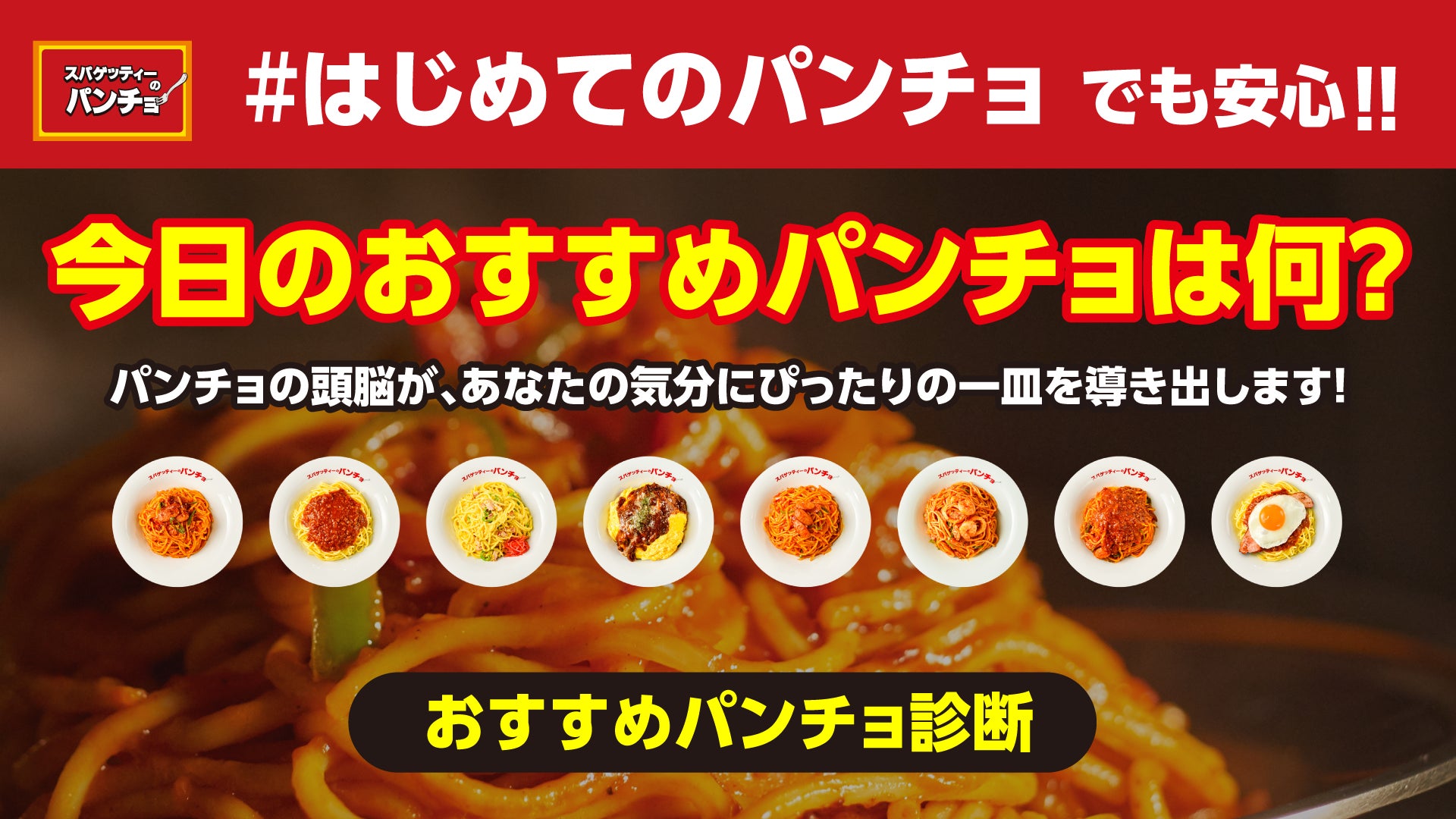 「自分に合った一皿が選べないよー」というパンチョ初心者のみなさんも安心してご来店いただけるように、春のナポ祭り開催に合わせて『おすすめパンチョ診断』を開発しました。はじめてのパンチョの方も、今日の気分でスパゲッティーを選んでみたい方も、ぜひ「おすすめパンチョ診断アプリ」を気軽にお試しください!