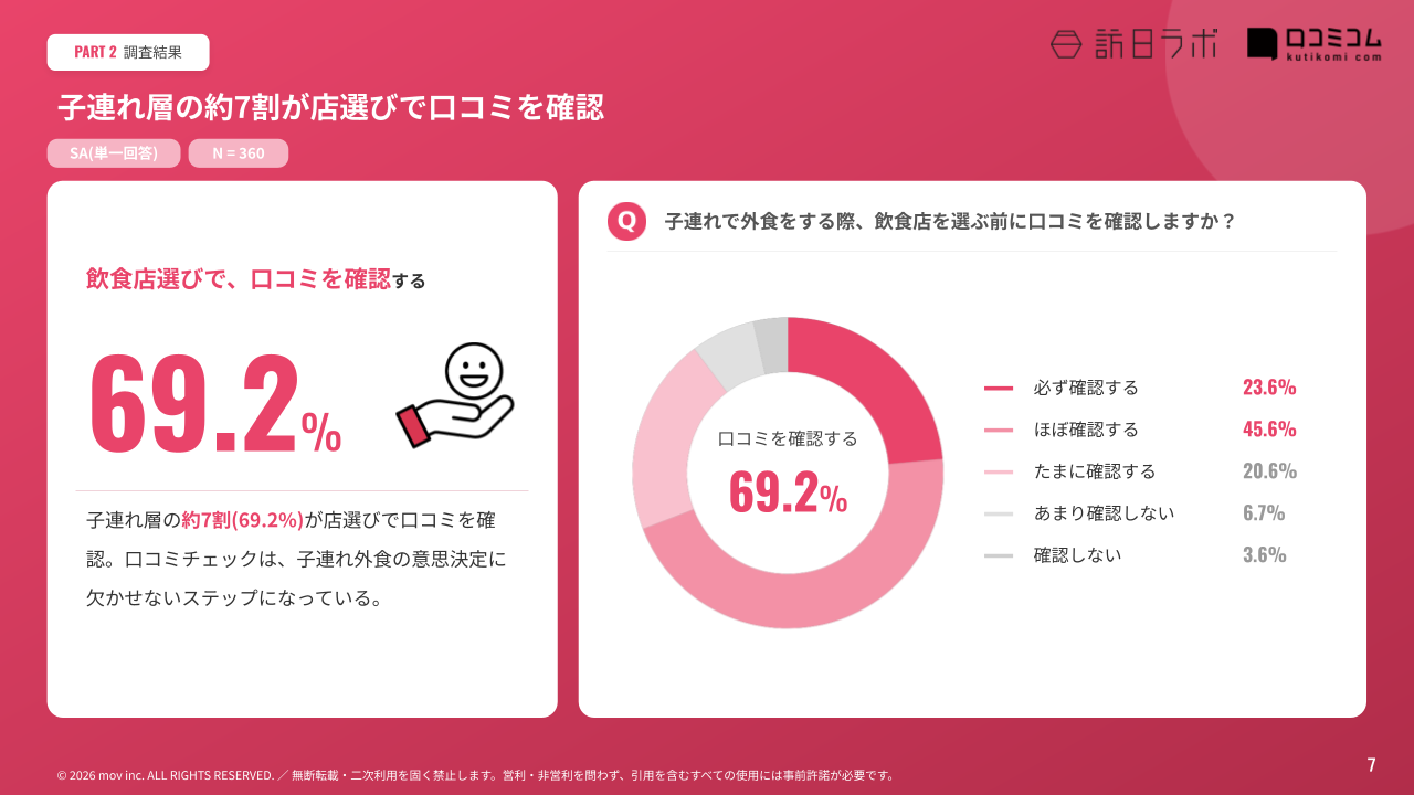 業界最大級のインバウンドビジネスメディア「訪日ラボ」及び 店舗向け集客一元化プラットフォーム「口コミコム」を運営する株式会社mov(代表取締役:渡邊 誠、本社:東京都渋谷区、以下mov)は、独自調査レポート「子連れの飲食店選びに関する調査レポート」を発表しました。