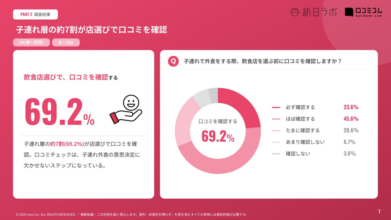 飲食店選びにおける口コミの影響度を調査したところ、子連れ層の約7割(69.2%)が店選び時に口コミを確認すると回答しました。さらに、子連れ関連の口コミが無い・少ない飲食店を候補から外した経験がある消費者は76.8%にのぼり、口コミの蓄積そのものが「選ばれる店」の前提条件になっていることが明らかとなりました。