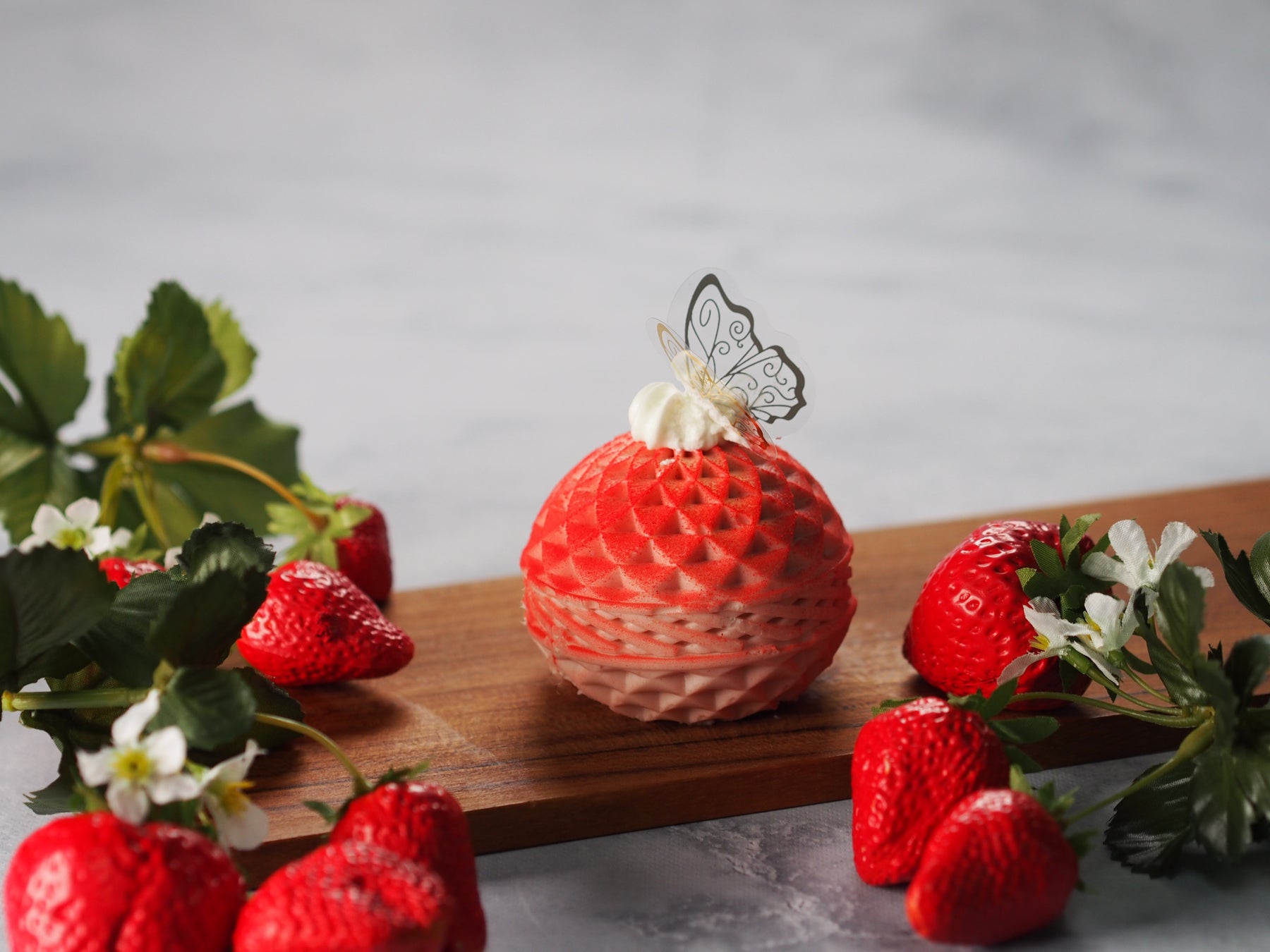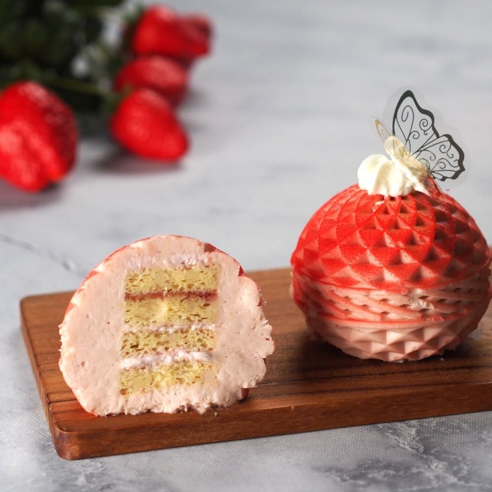 苺のムースの中には、香ばしいアーモンド生地と甘酸っぱいラズベリージャムを忍ばせました。赤のグラデーションの美しさと気品あふれる佇まいを、パティシエの技で一つひとつ丁寧に再現。まろやかな甘みとベリーの爽やかな酸味が織りなす、春らしい至福の味わいです。