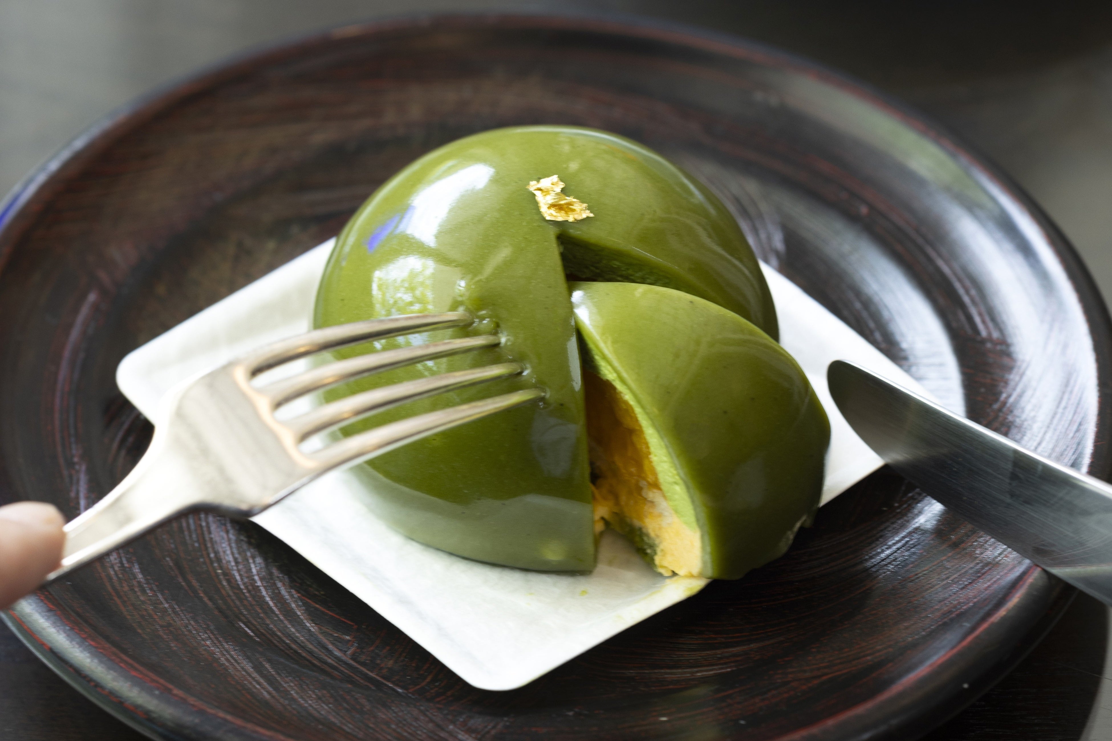 夏季は、爽やかな酸味が特徴のアプリコットのムースを使用し、軽やかな味わいに仕上げました。和三盆のやさしい甘みと香り高い抹茶のほろ苦さを重ねたムースの中に、アプリコットの爽やかな酸味を忍ばせ、外側には抹茶を練り込んだグラサージュをコーティング。一口目から抹茶の豊かな風味をお楽しみいただけます。
