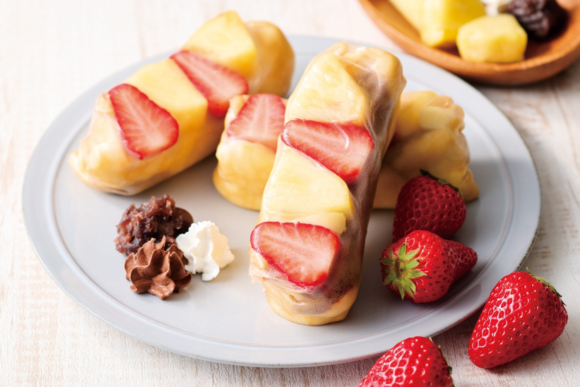 ホイップ、チョコホイップ、カスタード、つぶあんを重ねた“デザートのオールスター”に、近鉄百貨店が育てる希少ないちご「はるかすまいる」を合わせ、もちもちのクレープ生地で包んだ贅沢な一品です。和洋の甘みが重なり合う贅沢な味わいを、「はるかすまいる」の濃厚な甘酸っぱさが一層引き立てます。季節のフルーツとの組み合わせをお楽しみいただける、新感覚のワンハンドデザート。