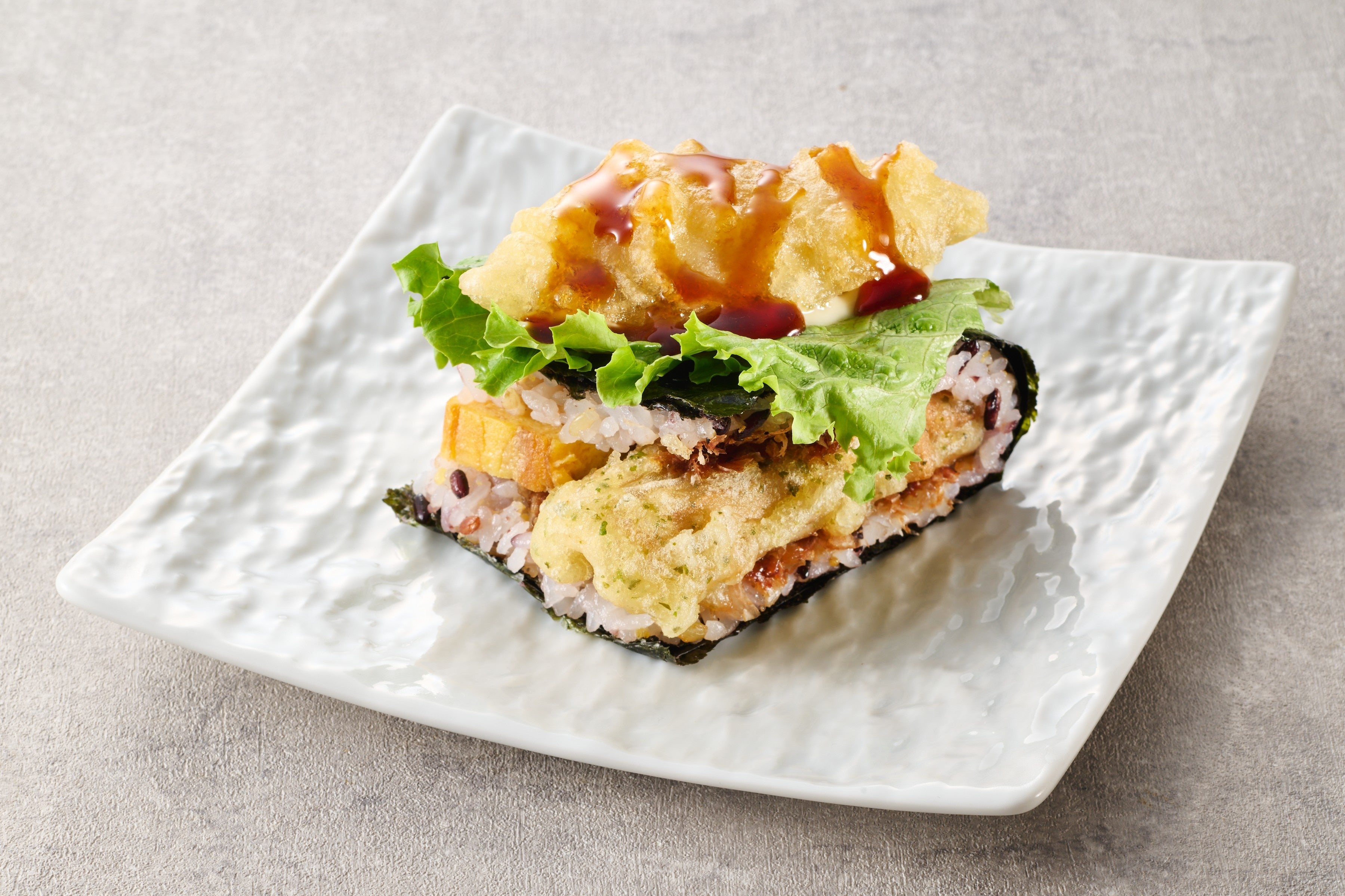 ほっかほっか亭の元祖「のり弁当」・万博グルメのメニューをベースに、ふっくらとした鱈の天ぷらを乗せて、百貨店仕様に新たにアレンジしました。まろやかな、おかかしょうゆをかけた十六穀米のごはんと贅沢に楽しむ鱈の天ぷら、からしマヨネーズをアクセントにした、新しい海苔弁体験です。