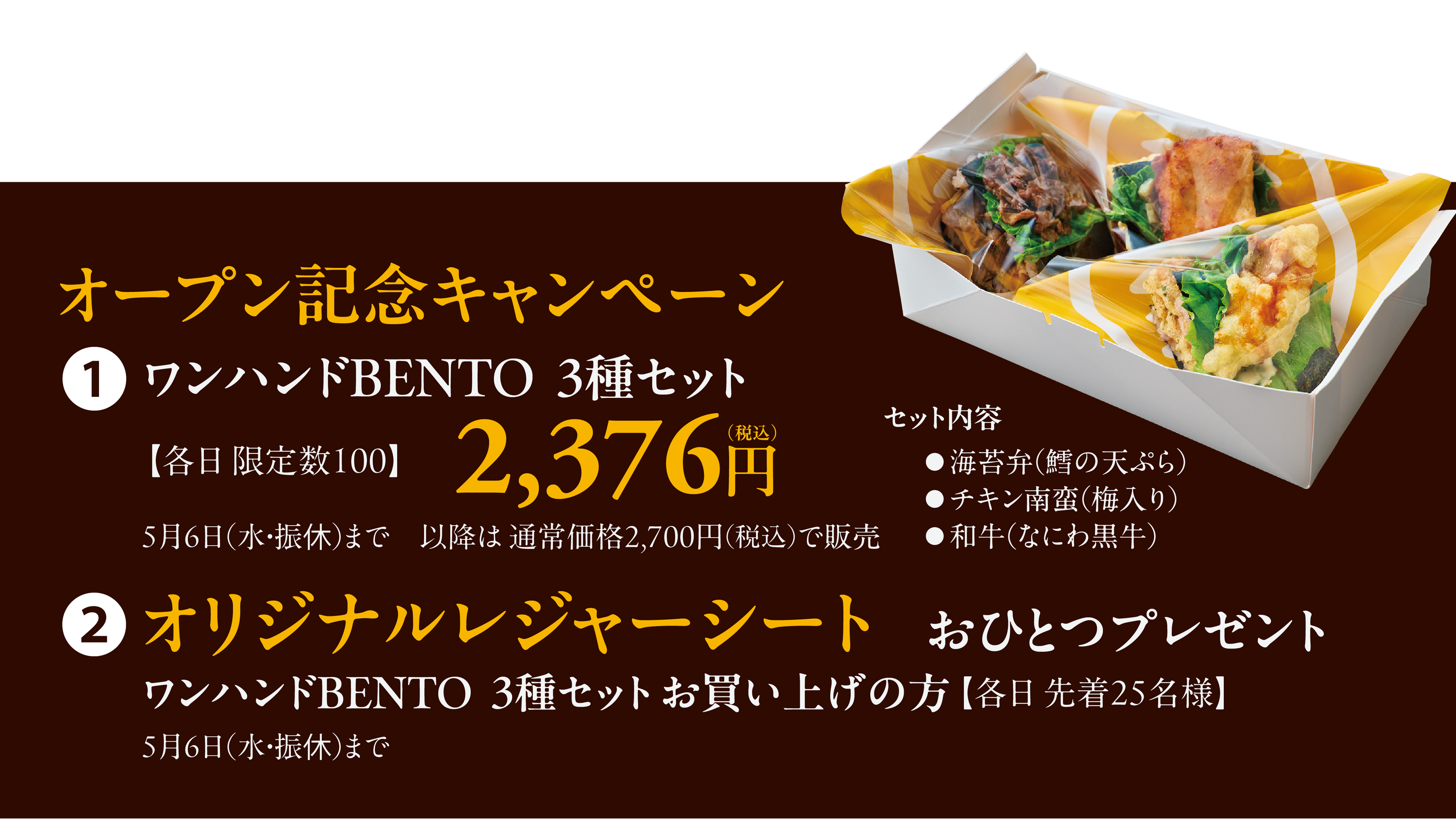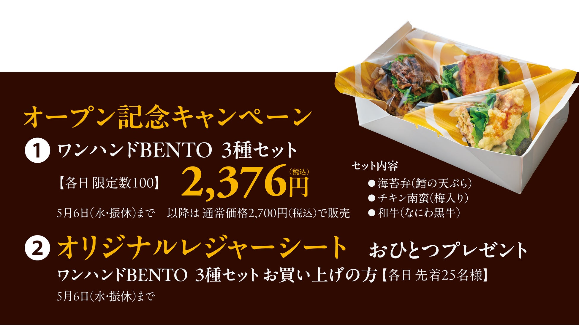 あべのハルカス近鉄本店 ウイング館地2階 惣菜エリアのグランドリニューアルに合わせて、4月29日(水・祝)~5月6日(水・振休)まで、人気のワンハンドBENTOを詰め合わせたセットをお得にご購入いただけるオープン記念キャンペーンを開催いたします。さらに、お近くの公園での利用にもぴったりなオリジナルレジャーシートも数量限定でご用意いたします。各日数量限定でのご用意なので、ご注文はお早めに!
