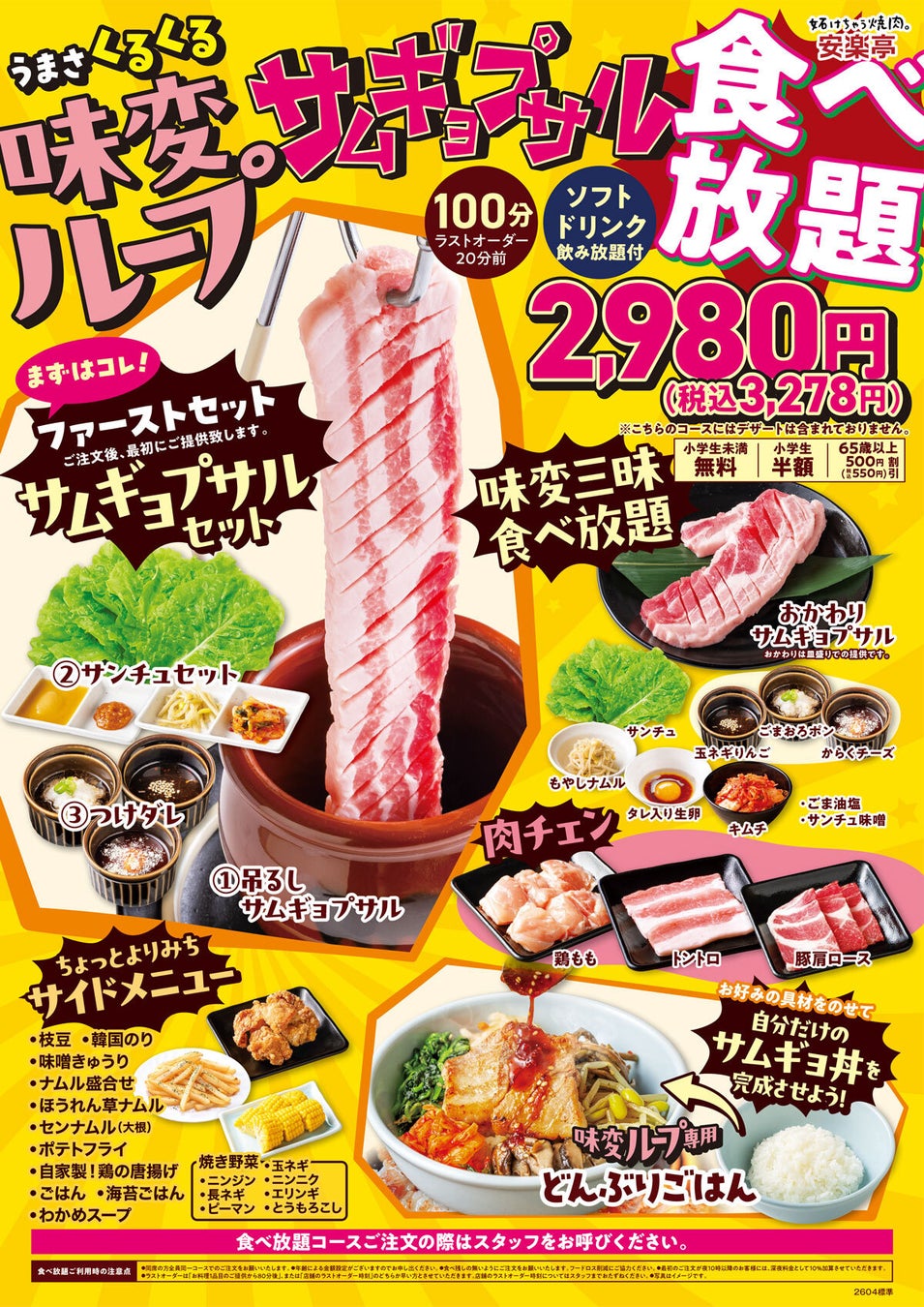 焼肉レストラン 安楽亭(所在地:埼玉県さいたま市)は、2026年4月28日より「”味変ループ”サムギョプサル食べ放題」を開始いたします。味変・カスタマイズ・シェアの楽しさを軸にした新しい食べ放題です。