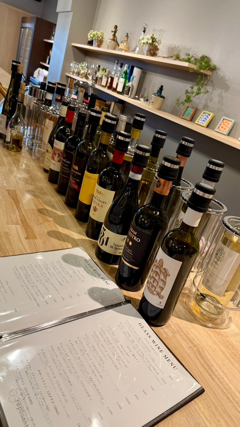 ワインは、インポーターとの直接取引や酒販店経由を含めて6社と取引し、現在はグラスワイン24種類、ボトルワイン49種類以上を展開しています。