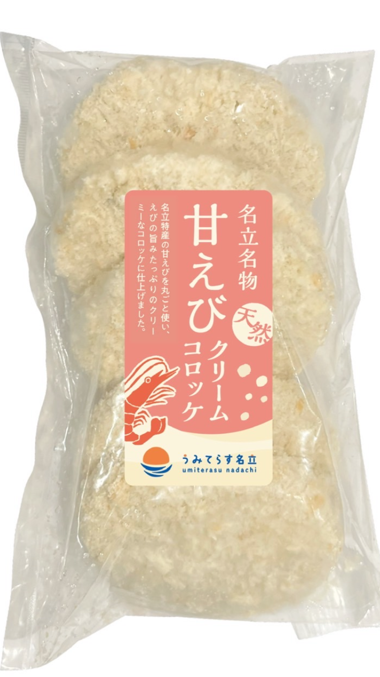 道の駅うみてらす名立1階の食彩鮮魚市場では、お持ち帰り用の冷凍「甘えびクリームコロッケ」を販売。60g×5個入り、980円(税込)でご提供します。ご家庭でも同じ味を楽しみいただけます。