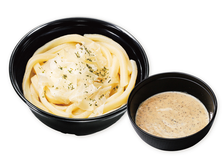 コシが強く太さのある讃岐うどんを使用。つけ汁は、トリュフクリームに黒トリュフソースを合わせた特製仕立てで、トリュフの香りとコクをしっかりと感じられ、濃厚なつけ汁が麺によく絡みます。うどんの上にはフェザーチーズとパセリをトッピングしており、麺の熱でチーズがほどよく溶け、つけ汁に絡むことで一体感のある贅沢な味わいを楽しめます。