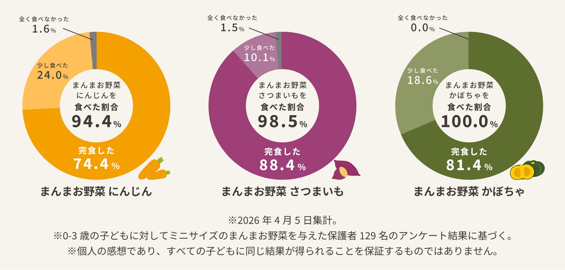 【まんまお野菜】のミニサイズの試供品を用いたモニターアンケートを実施した結果、0-3歳の約94.4%が【まんまお野菜】を食べたというデータを取得しました。