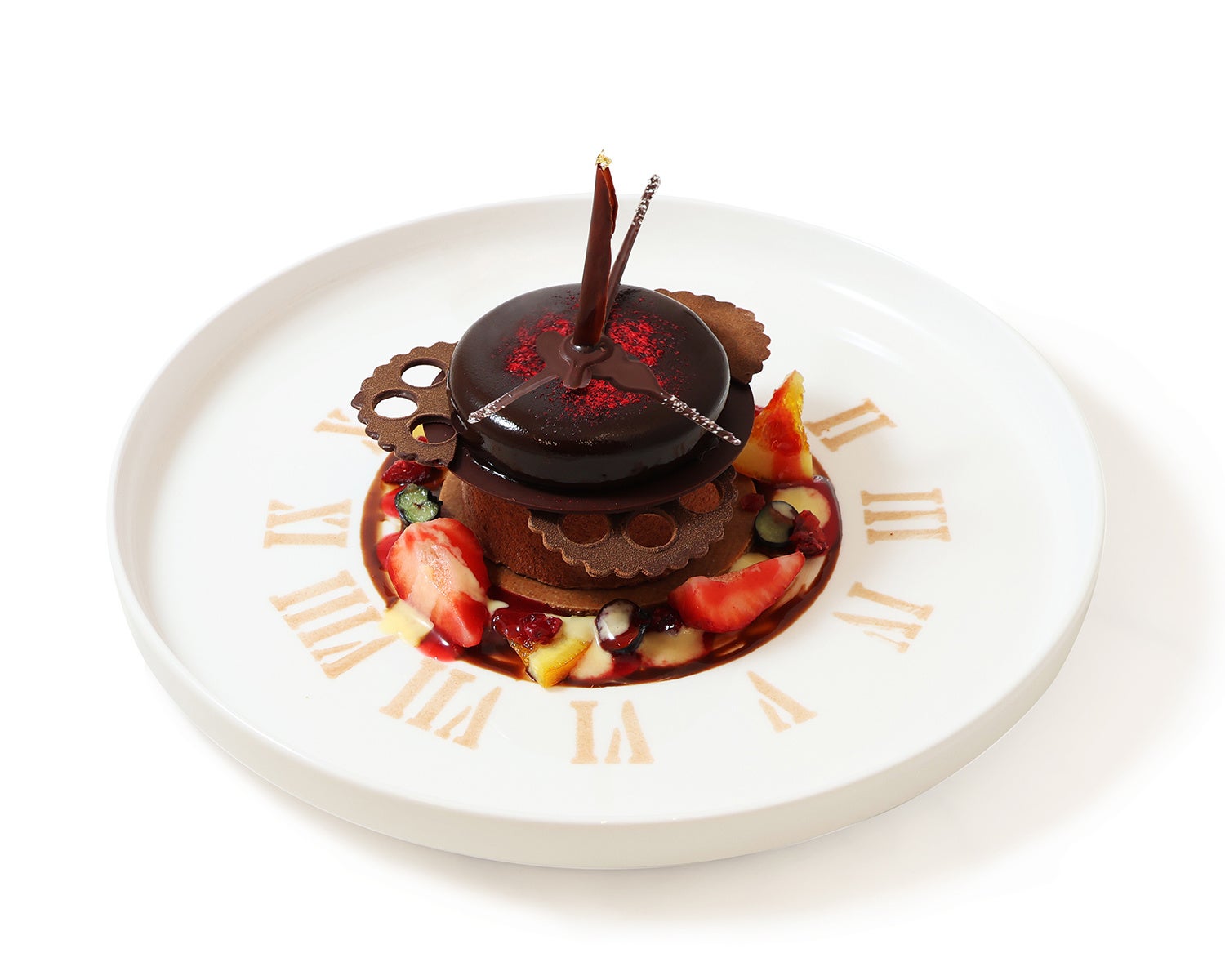 5周年を記念し、“時を刻む時計”をモチーフに仕立てたスペシャルショコラデセール。自家製ヘーゼルナッツプラリネとミルクチョコレートのパルフェに、カカオの果肉のソルベを忍ばせたグラスショコラです。周囲には苺、ブルーベリー、クランベリー、オレンジ、フランボワーズをあしらい、アングレーズソースで華やかに仕上げました。味わいとともに、記念のひとときを演出します。